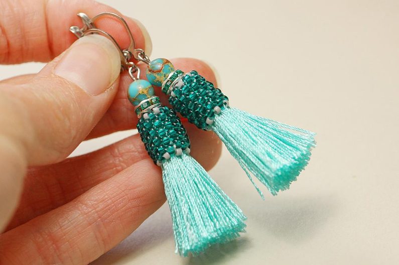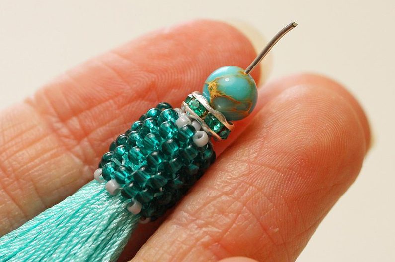 Skrz zašitou špičku střapce protáhneme ketlovací nýt, aby vycházel středem vrcholu, navlékneme na něj ŠR6 a korálek z minerálu a nýt zkrátíme tak, aby zbýval cca 1 cm.