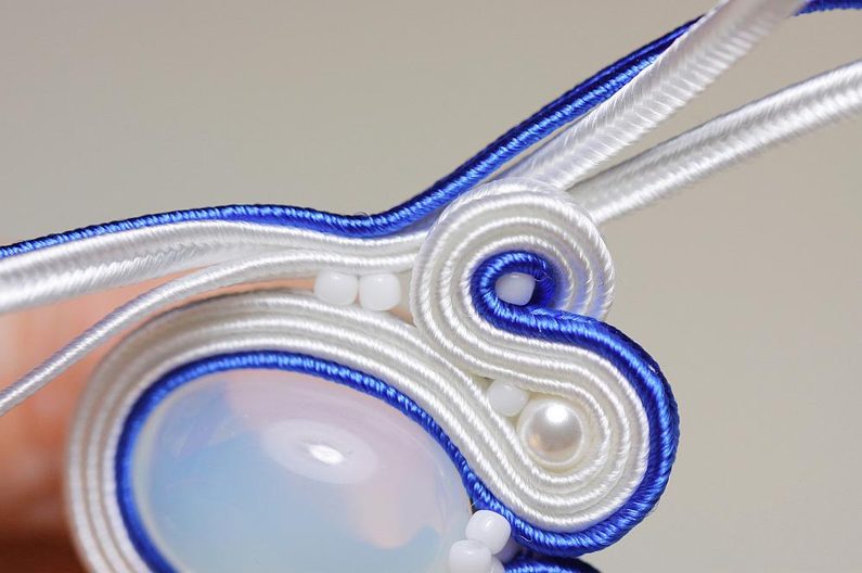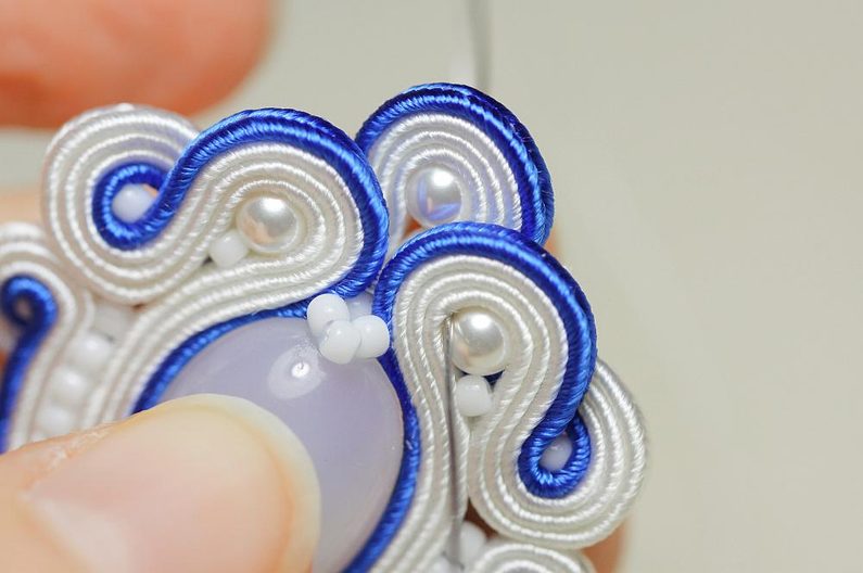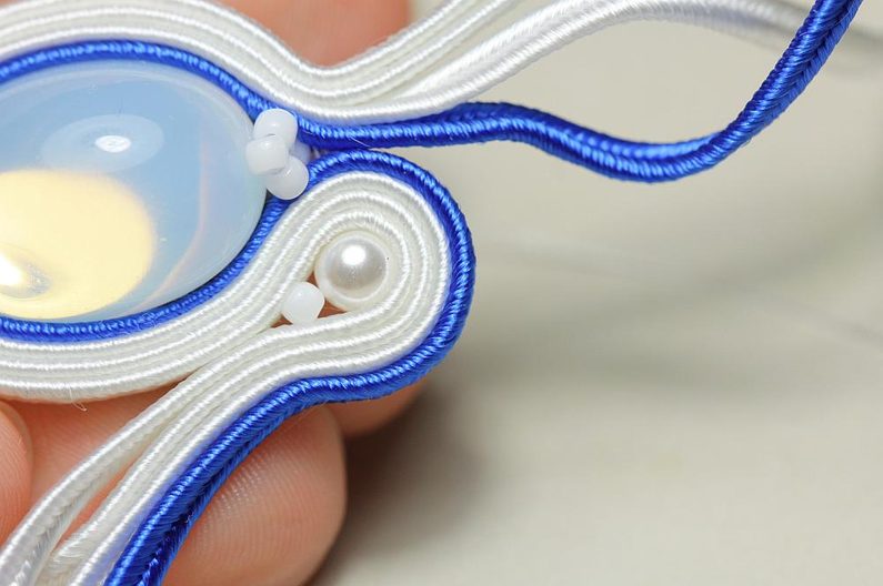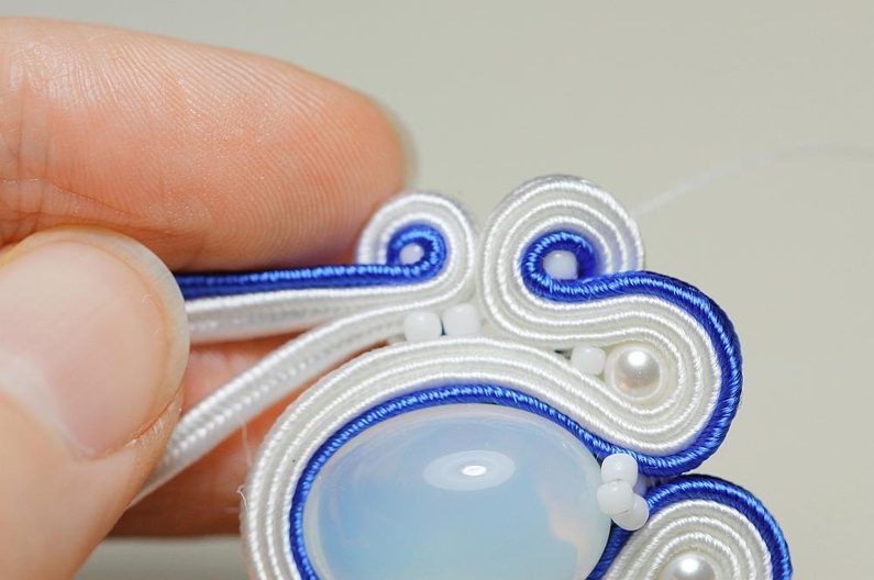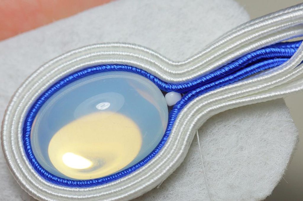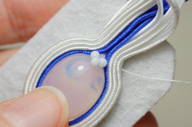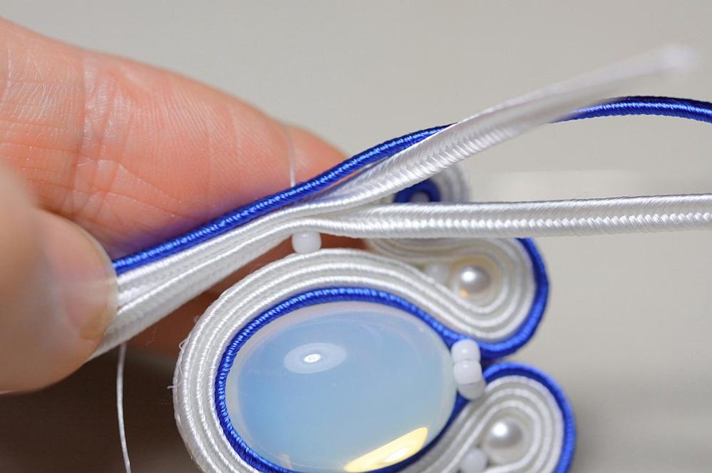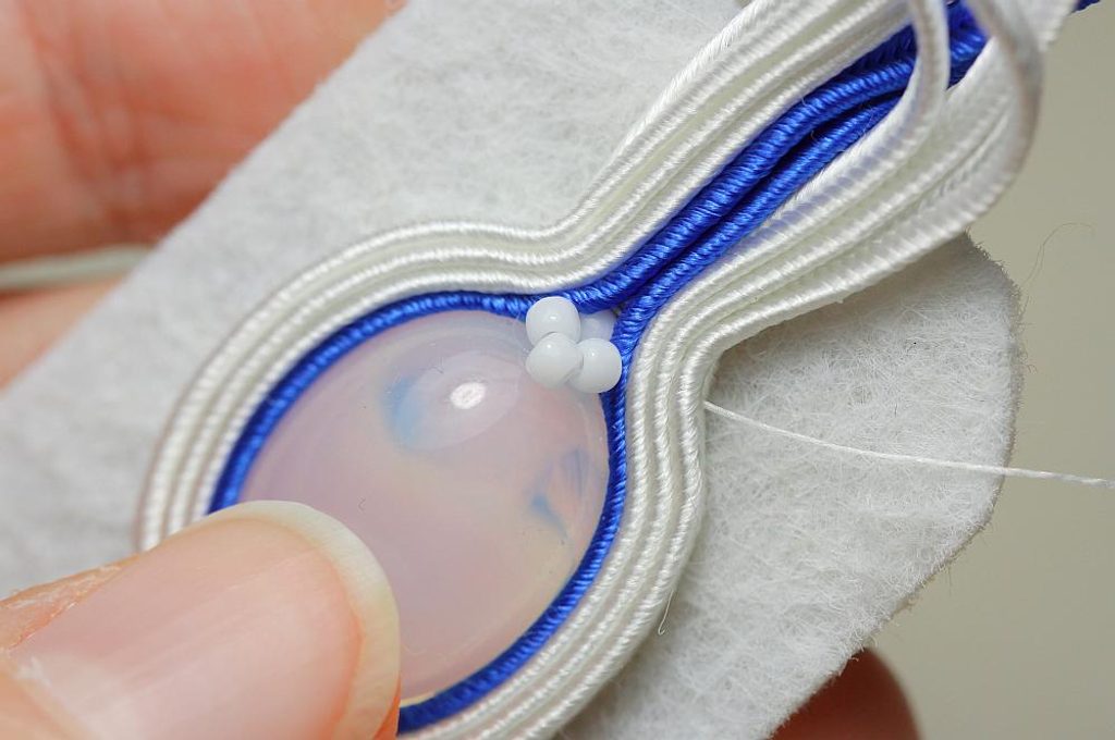 Ustřihneme si 12 cm dlouhé sutašky: 2 bílé a 1 modrou. Začneme je našívat na levou stranu náušnice, přičemž mezi sutašky ze základního obšití kabošonu a tyto nové sutašky všíváme vždy 1x TR11. Uděláme si nejdříve pár prvních stehů na kraji, abychom pak konce přišili několika stehy k malému obloučku z minulého kroku.