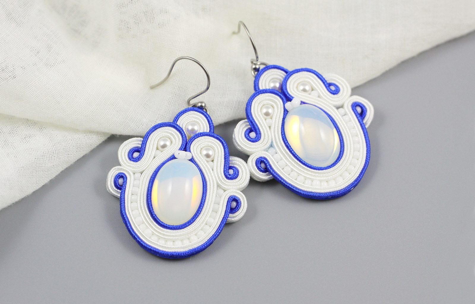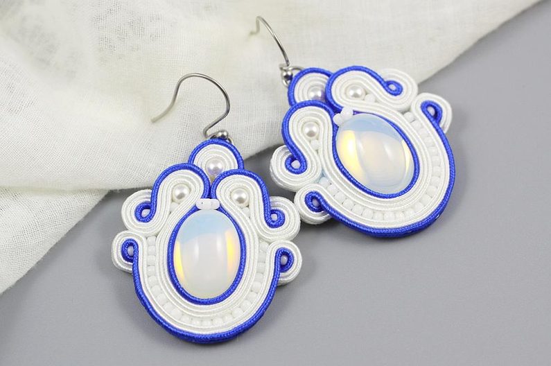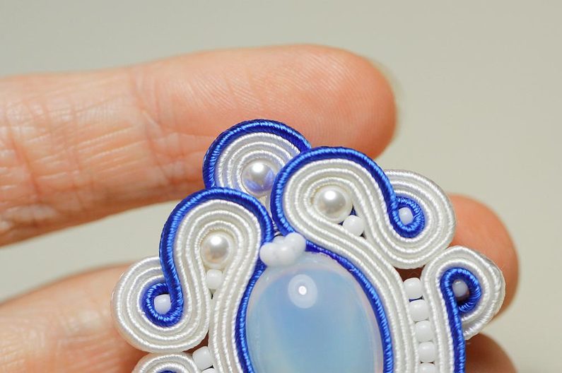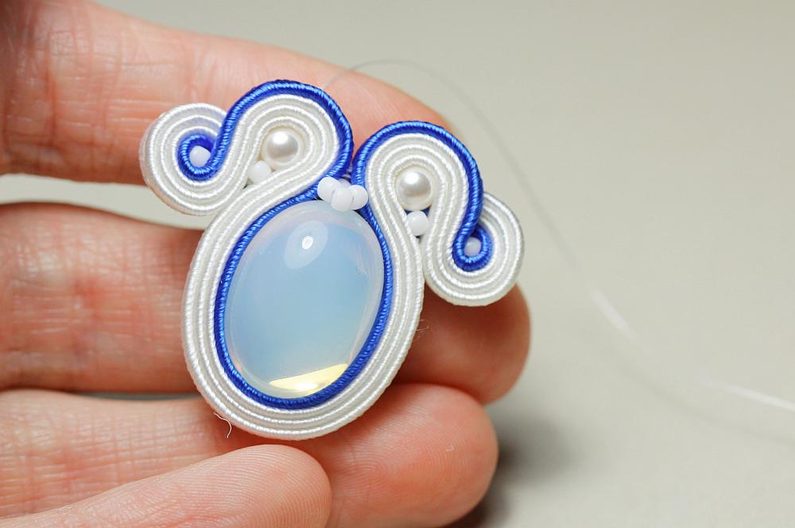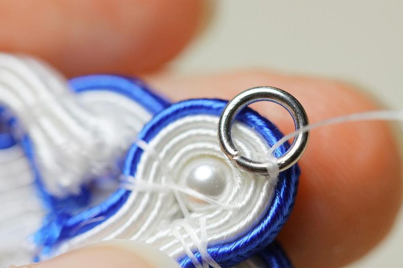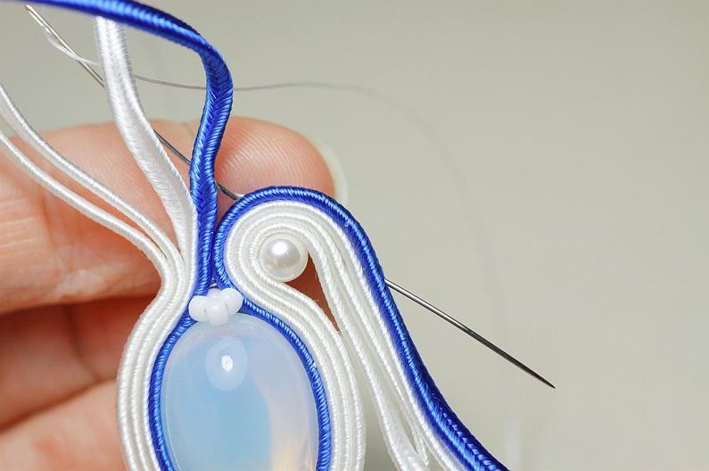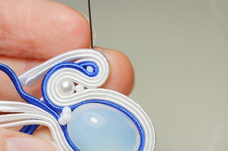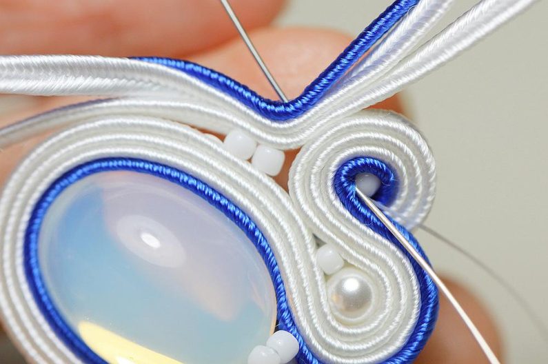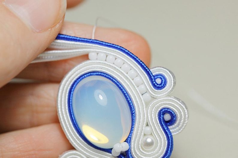 Ustřihneme si 12 cm dlouhé sutašky: 2 bílé a 1 modrou. Začneme je našívat na levou stranu náušnice, přičemž mezi sutašky ze základního obšití kabošonu a tyto nové sutašky všíváme vždy 1x TR11. Uděláme si nejdříve pár prvních stehů na kraji, abychom pak konce přišili několika stehy k malému obloučku z minulého kroku.