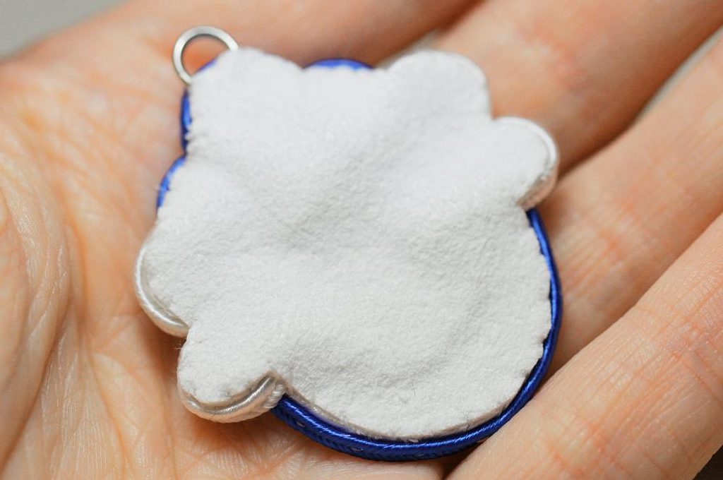 Otočíme rubem nahoru a k právě našitému motivku přišijeme spojovací kroužek tak, aby ho kousek přečuhovalo přes.