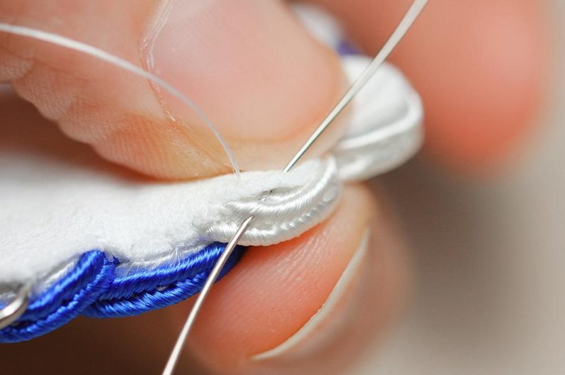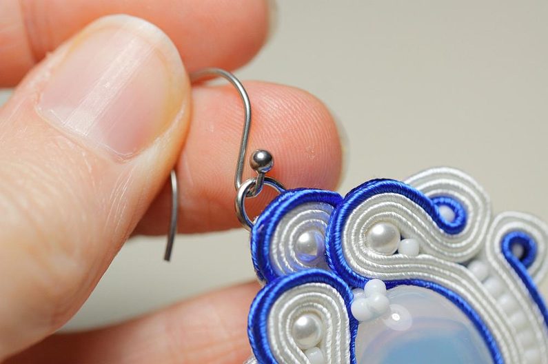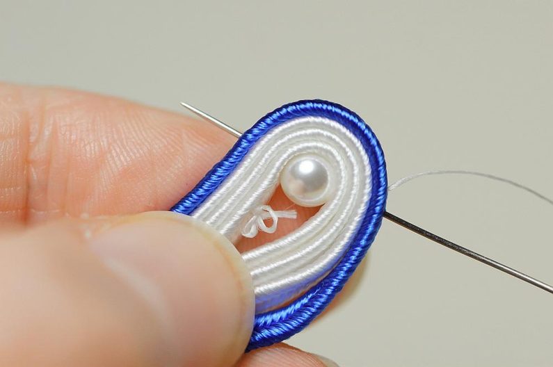Drobnými nůžkami opatrně odstřihneme přebytečný podklad a jemnými krátkými stehy přišijeme podklad k okraji sutaškové náušnice.