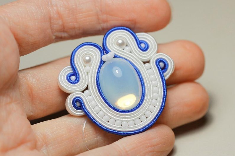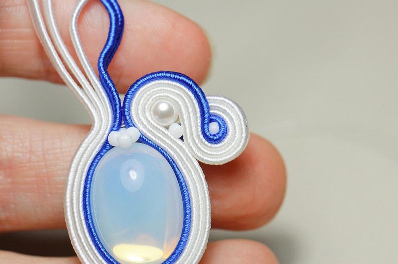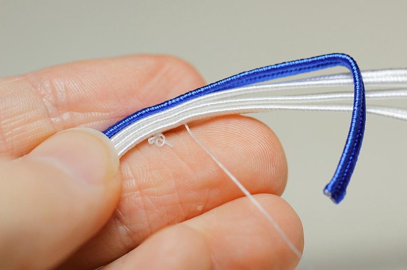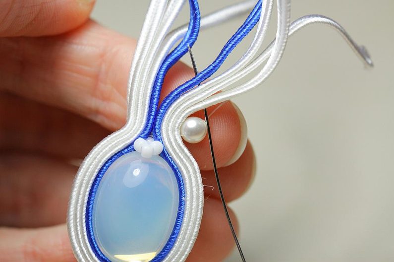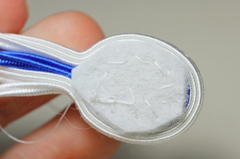 Kabošony si nalepíme na filc nebo semišový podklad a necháme zaschnout. Ustřihneme si sutašky: 3 ks bílé a 1 ks modré, všechny v délce 17 cm. Do blízkosti kabošonu jako na fotce zespodu píchneme jehlu s nymem a zároveň propíchneme i sutašky – jehlu vedeme jejich středovou „drážkou“ asi 6 cm od levého konce.