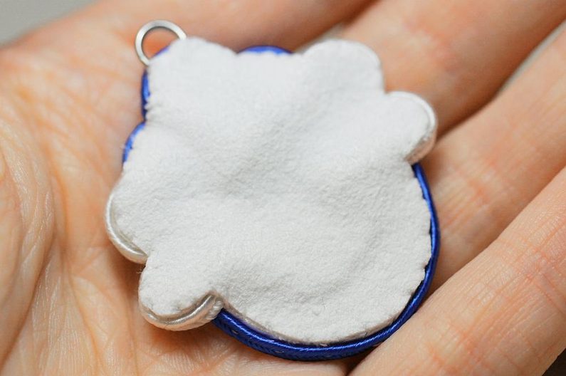 Celou zadní stranu potřeme trochou lepidla (včetně místa, kam jsme právě našili kroužek) a přiložíme semišový podklad. Necháme aspoň trochu zaschnout.