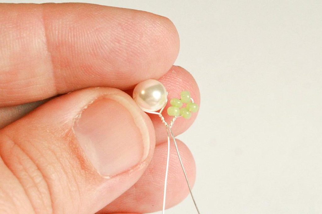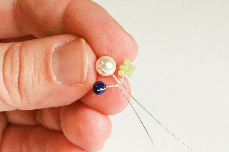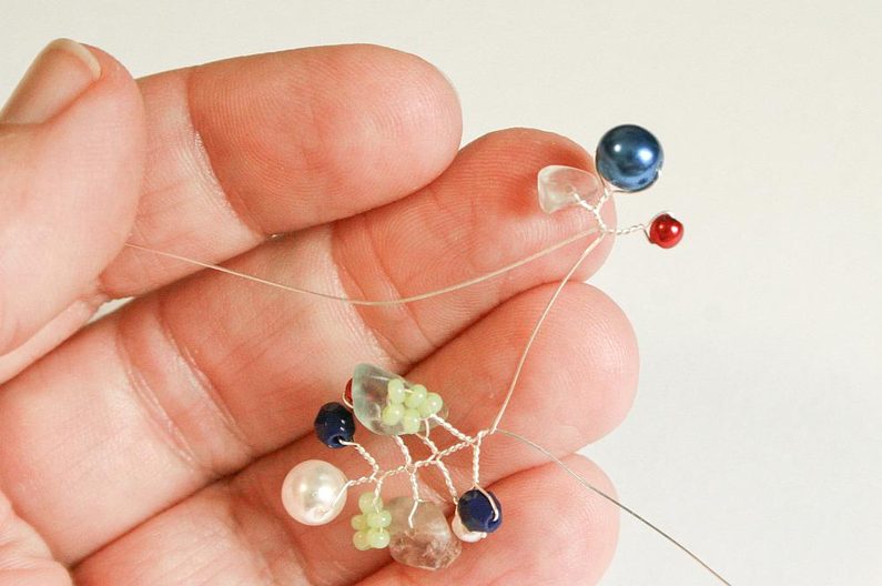 Dále uděláme boční větvičku. Na jeden z konců navlékneme VPK6d a uděláme pár otoček s odstupem na délku větvičky (Obr. 6). Dále na volný konec drátu navlékneme zlomek, otočíme tři krát a poté stočíme oba dráty k sobě (Obr. 7). Pak na volný konec navlékneme VPK3c a opakujeme postup (Obr. 8). Opakujeme se střidaním korálků až bude boční větev hotova (Obr. 9).