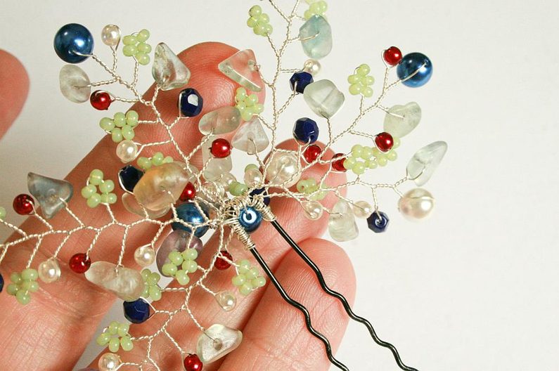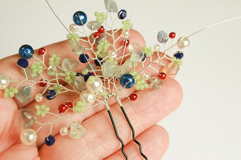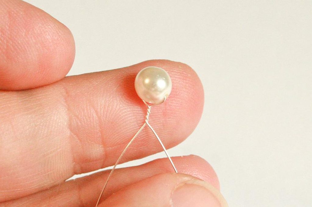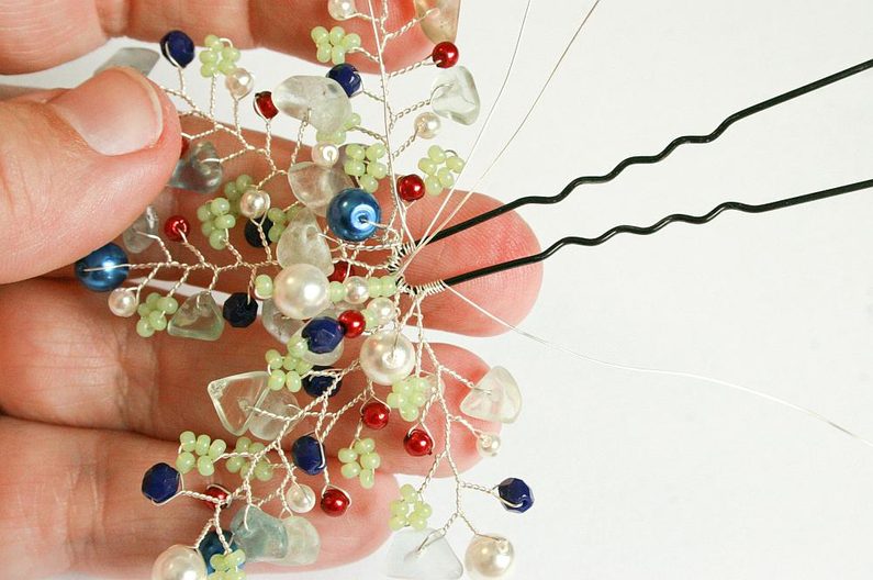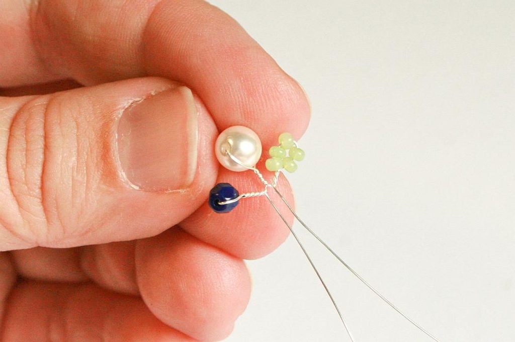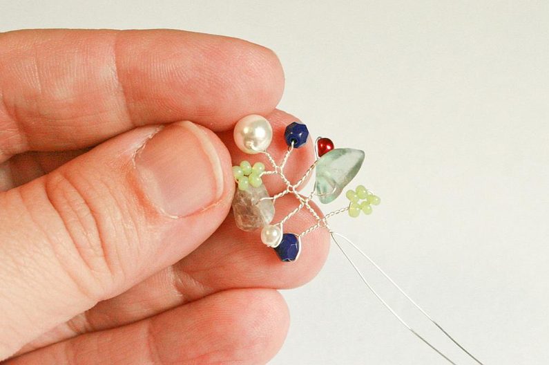 V posledním kroku zakryjeme místo, kde jsme připojovali větve korálky. Navlékneme velké korálky VPK6d / VPK6b na zbytek drátu a přimotáme ke sponce (Obr. 15-18). A sponka je hotová.