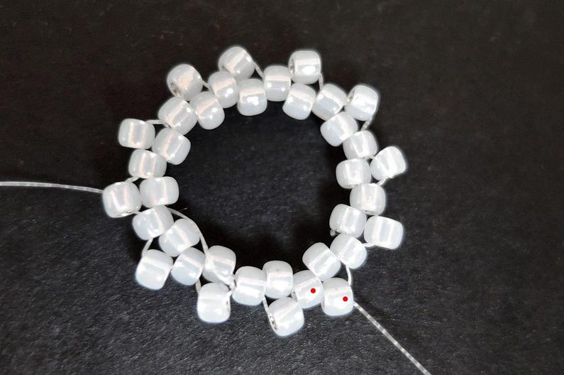 Ustřihněte si Fireline (cca 60 cm – zbytek použijete k sešití kabošonů s rivolkami). Navlékněte si jehlu a poté 24 ks TR11. Spojte pevně do kroužku tak, aby zůstalo na druhé straně cca 20 cm Fireline.