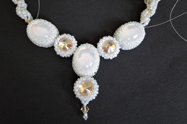 Poskládejte si střed náhrdelníku, jak by cca měl vypadat (obr. 22), a nyní začněte pečlivě sešívat (šijte do částí obšití kabošonů, které byly šité peyotem) k sobě jednotlivé části zbytky Fireline z obšití Swarovski rivolek (obr. 23). Po každém přišitém kousku si stále přikládejte k poskládané kompozici, aby bylo hned vidět, kdyby byla nějaká část sešitá „mimo“.