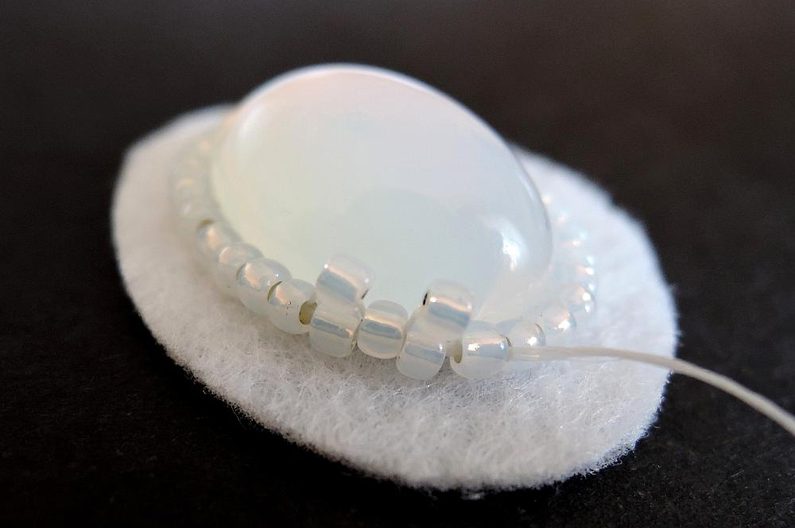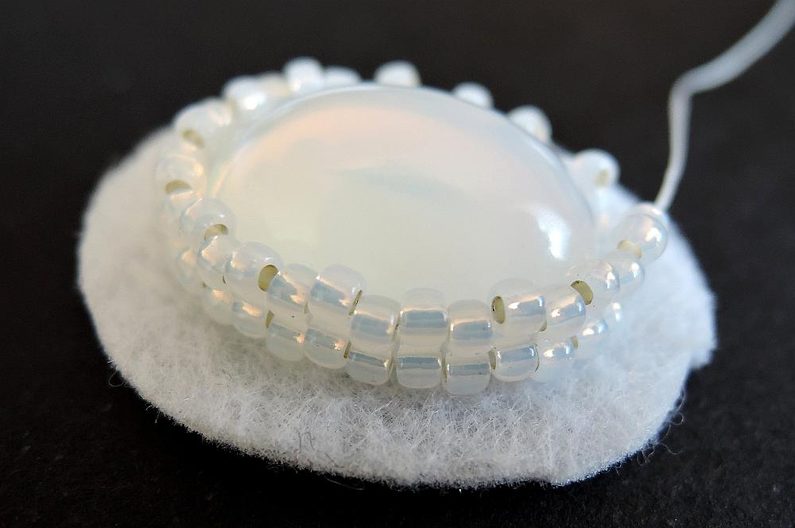 Navlékneme 4 TR11, stáhneme na niti dolů a přiložíme těsně vedle kabošonu. Těsně za nimi prošijeme dolů a následně zpátky nahoru v úrovni před dvěma TR11 (obr. 1). Následně těmito dvěma projdeme skrz, navlékneme opět 4 TR11 (obr. 2) a opakujeme předchozí postup. Takto obšijeme celý obvod kabošonu. Na konci přidejte buď také čtyři, nebo jen dva TR11 podle toho, jak velká je mezera (Počet musí být sudý! Můžete využít drobných nepřesností ve velikosti korálků, aby dobře pasovaly).