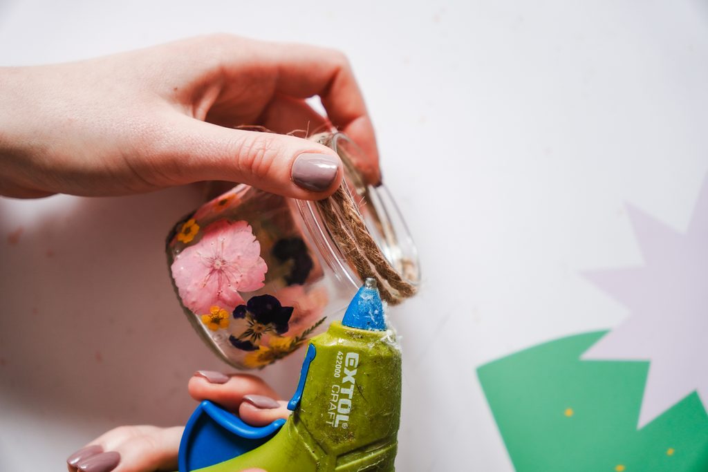 Podél obvodu hrdla skleničky omotáme jutový provázek. Můžeme přilepit tavnou pistolí.