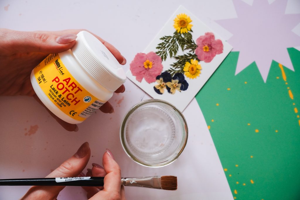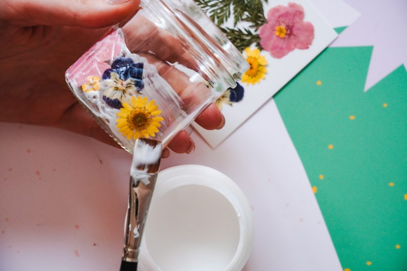 Vezmeme si jakoukoliv skleničku od marmelády nebo okurek a očistíme ji od etiket a lepidel. Pomocí štětce a lepidla ArtPotch po obvodu nalepíme sušené květiny a necháme zaschnout.