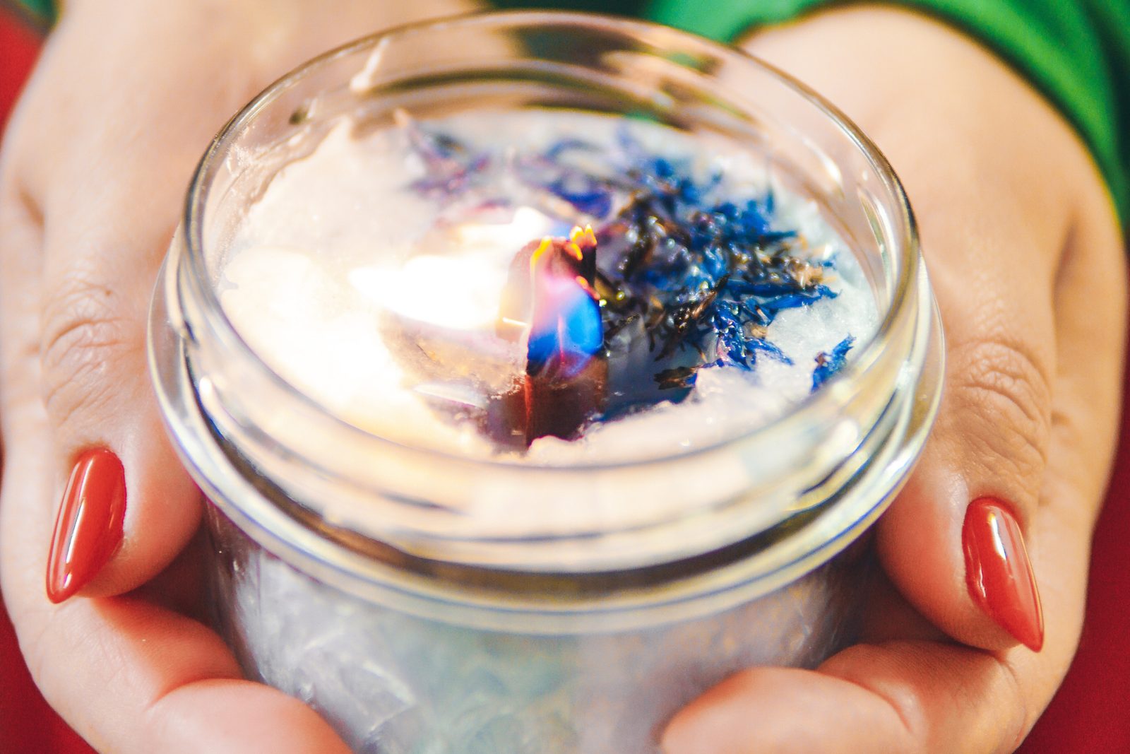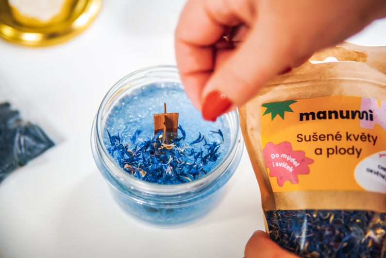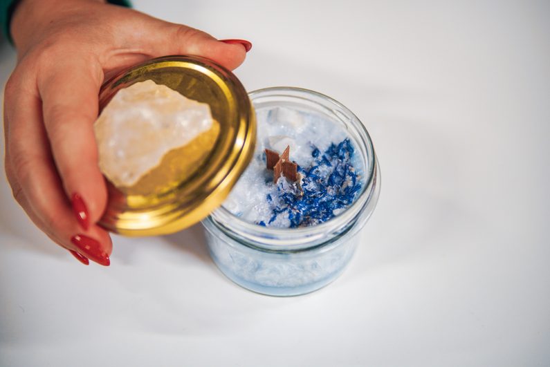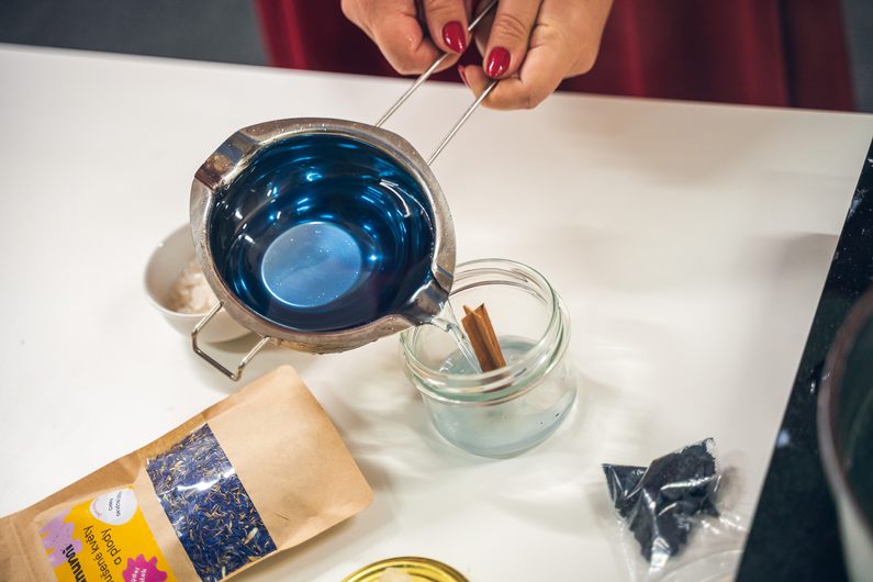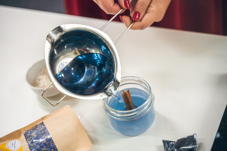 Vosk necháme chvilku zchladnout a poté nalijeme do sklenice. Jakmile je vosk téměř ztvrdlý, na jeho povrch nasypeme sušené květy a minerálové krystalky. Pokud se s voskem nespojí, můžeme ho trochu rozehřát horkovzdušnou pistolí nebo na povrch tenkou vrstvu vosku dolít.