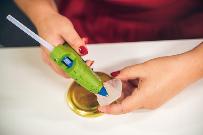 Na víčko sklenice, které jsme očistili od samolepicí etikety nalepíme tavnou pistolí velký surový minerál. A krásná dárková svíčka je hotová. Před zapálením nechte svíčku 48 hodin odpočinou. Nikdy ji nenechávejte hořet bez dozoru.