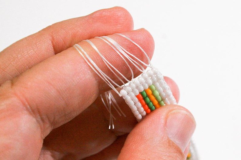 Pokud nám došla nit během tkaní, uvážeme novou nit (stejně jako na začátku) k niti osnovy a provlečeme jí dvě až tři řady již utkaných korálků a vrátíme zpět na konec tkaní pro pokračování.
