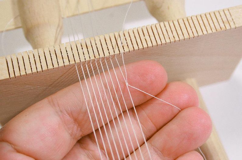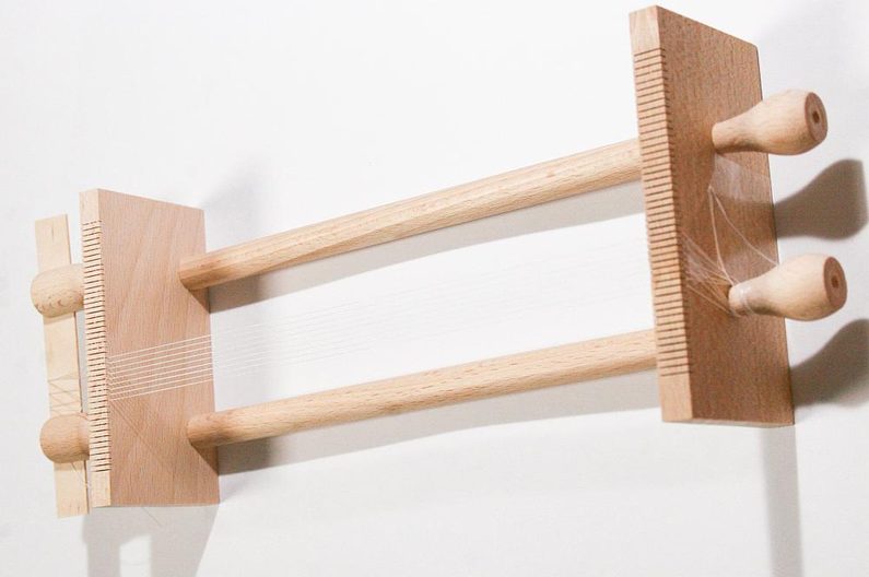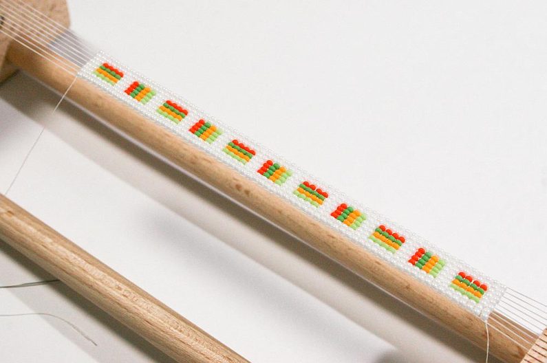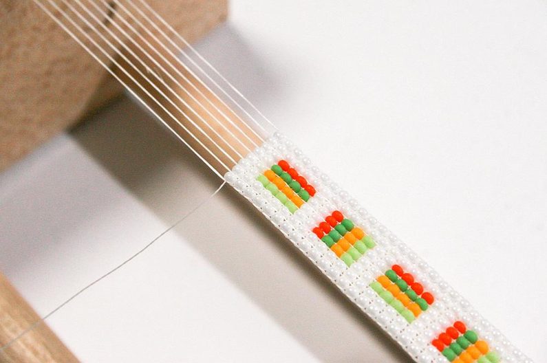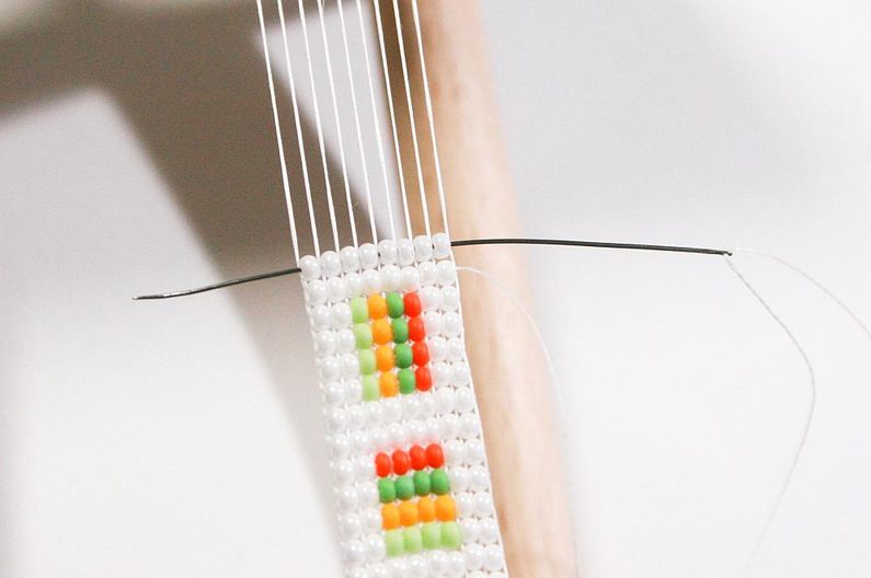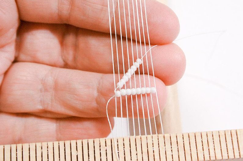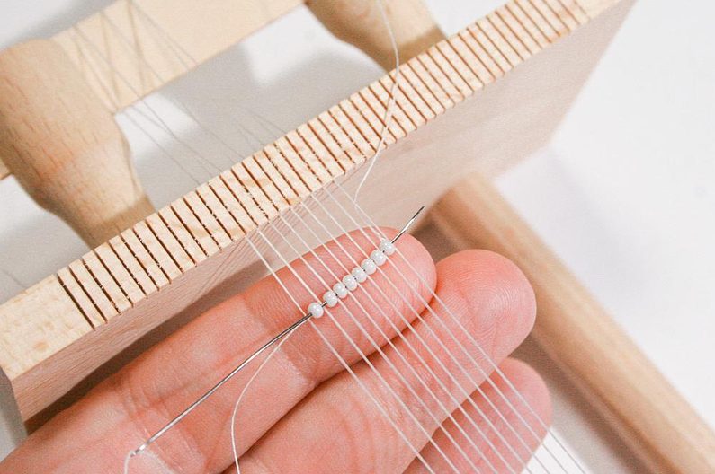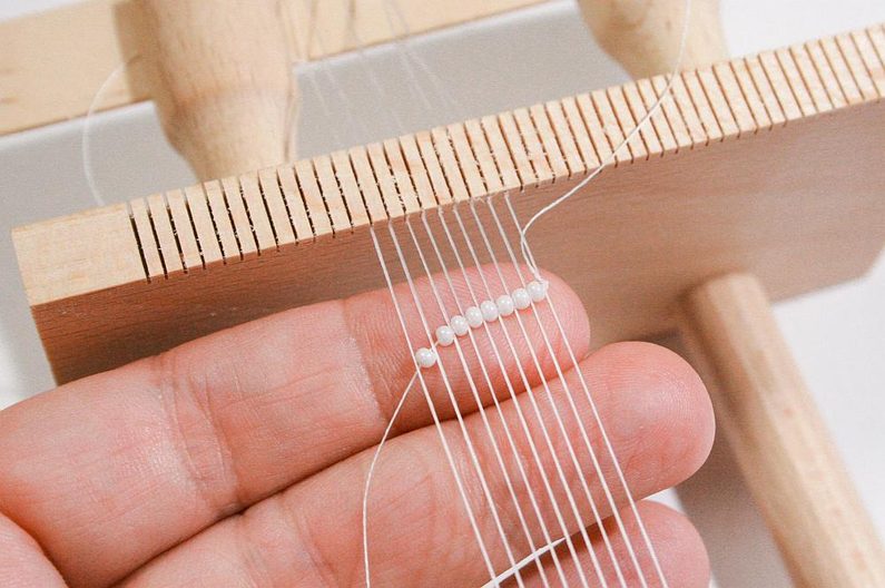 Nejdříve instalujte podle instrukcí dřevěný rám. Natáhněte nitky, počet nitek by měl činit o jednu více, než máte počet korálků v řadě (Obr. 1) – to je osnova,na které budeme tkát korálky.