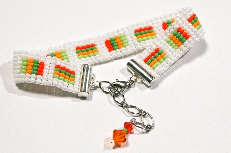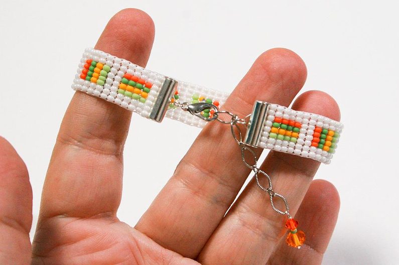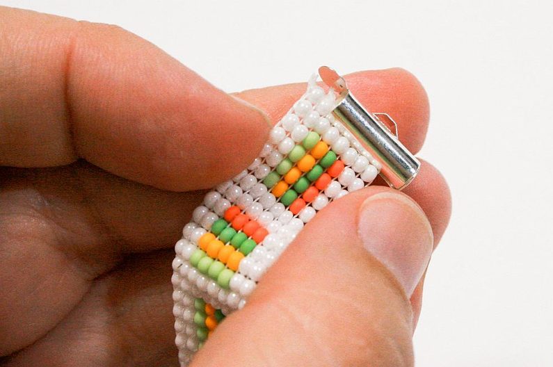 Zasuneme jednu řadu korálků do zapínáníi(Obr. 15–16), pomocí spojovacích kroužků připevníme karabinku a prodlužovací řetízek s ozdobným příivěskem (Obr. 17–18). Tkaný náramek se dá hezky kombinovat s jinými náramky.