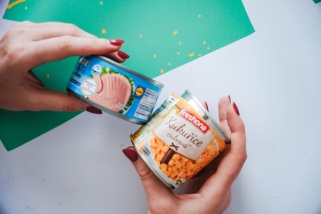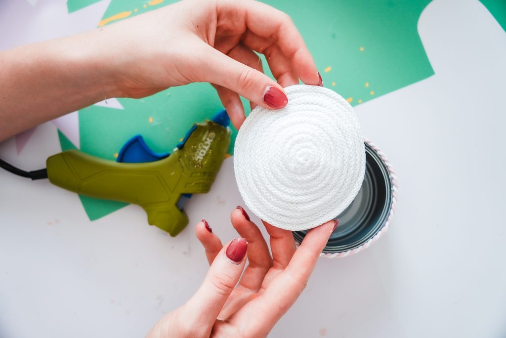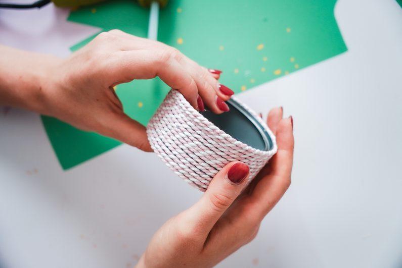 Tímto způsobem můžeme zužitkovat plechovky například od tuňáka nebo kukuřice. A navíc využít zbytky macramé šňůr. Sloupneme etiketu a pomocí tavné lepící pistole lepíme kolem plechovky přízi odspodu nahoru.