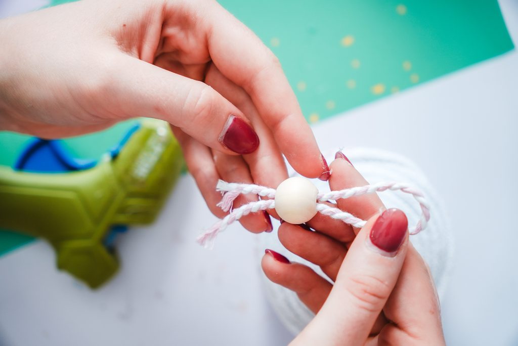 Nakonec nahoru můžeme přidat ještě zbytek příze, kterou jsme omotávali plechovku, kterou vytvoříme poutko navlečené na dřevěný korálek se širokým průtahem. Opět připevníme pomocí tavné lepící pistole.