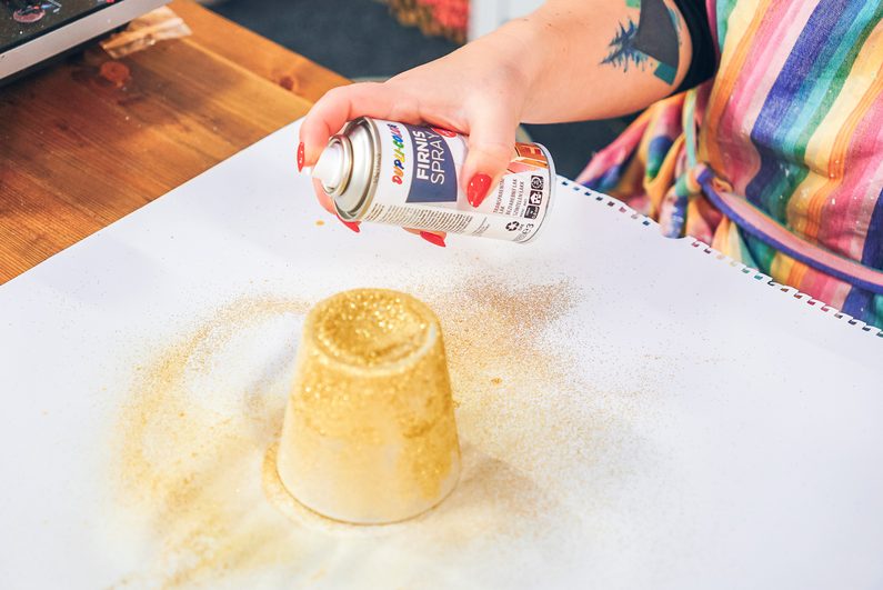 Jakmile třpytky s barvou zaschnou, vše zalakujeme matnou barvou ve spreji. Ta v kombinaci s lesklými třpytkami vytvoří zajímavý efekt. Opět necháme zaschnout.