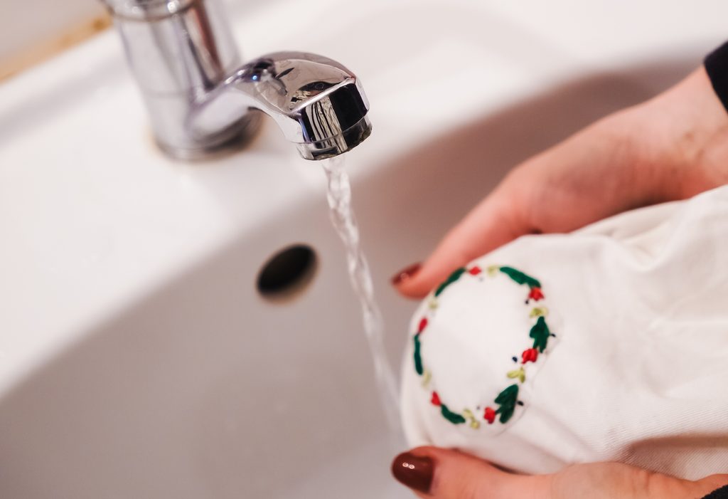 • Když máme vyšito, samolepku vymyjeme pod tekoucí vodou. Necháme tričko uschnout.