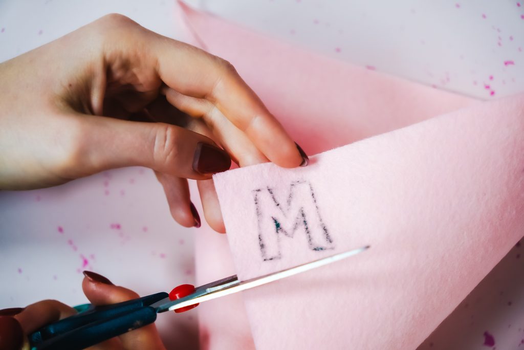 • Z filcu si vystříhneme písmenko nebo libovolný tvar jako třeba srdíčko a bavlnou našijeme doprostřed vyšitého kruhu.