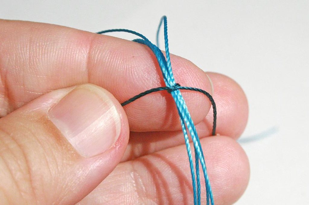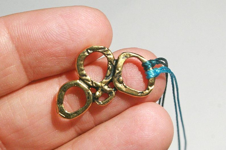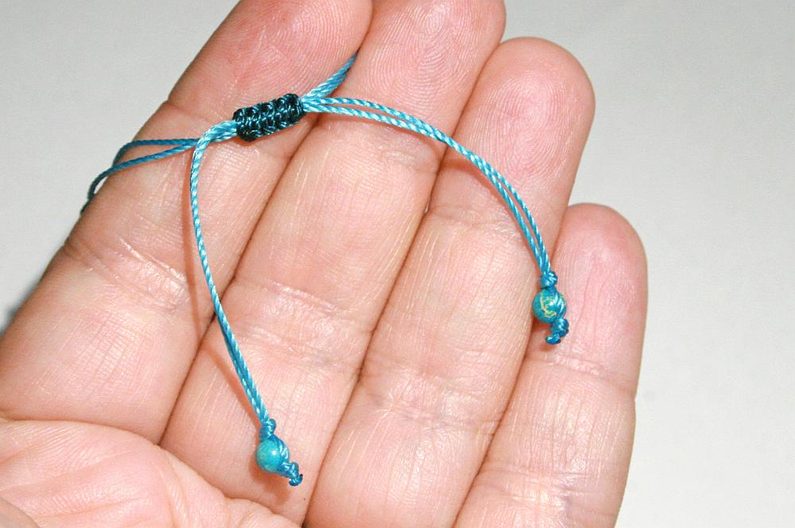 Necháme konce cca 5-7cm dlouhé, zavážeme na každém konci šňůry uzel, navlékneme na každý konec korálek 4mm a zavážeme ještě po jednom uzlíku na každém konci šňůry (Obr. 24).