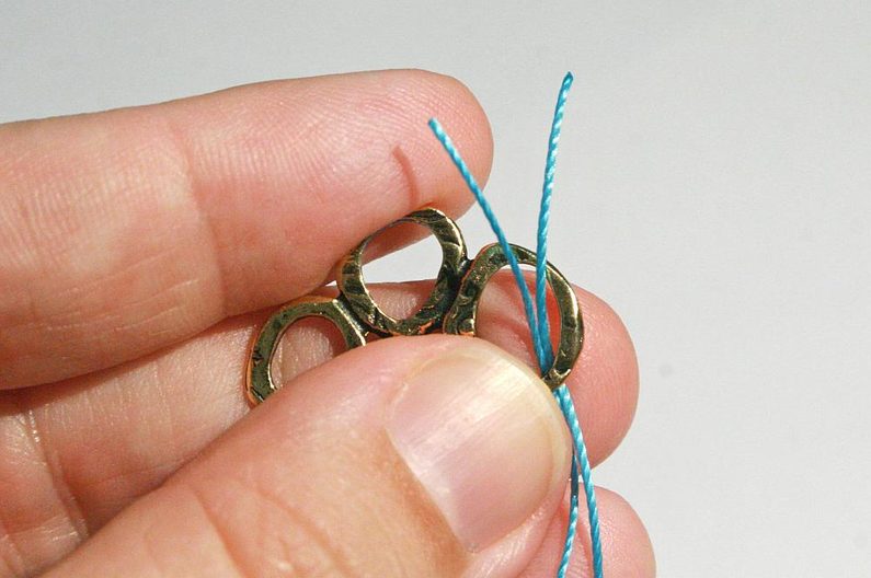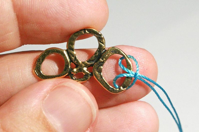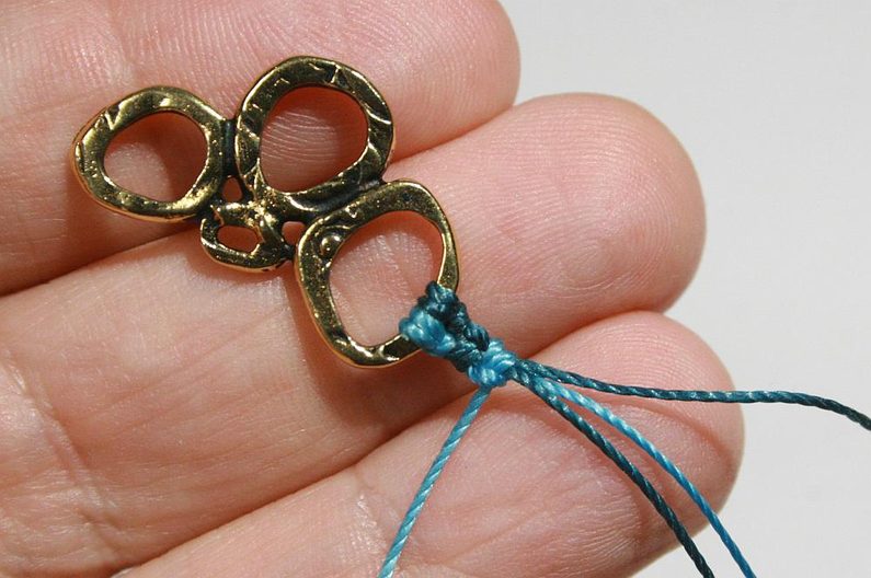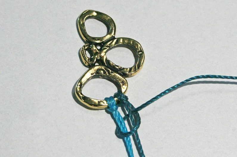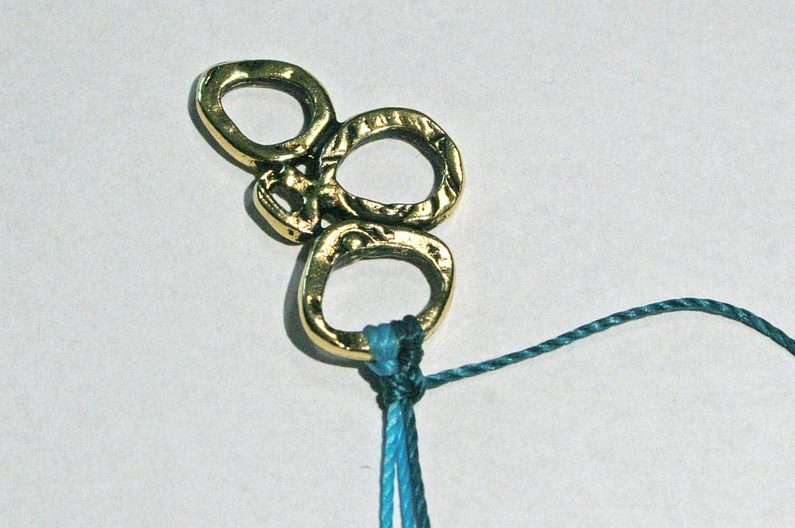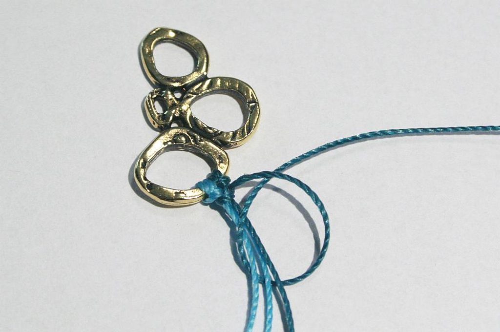 Ustřihneme po 1m od každé barvy šňůry. Připevníme ke komponentu Intermix. Šňůrku ohneme napůl a konce prostrčíme otvorem komponentu Intermix (Obr.1). Konce provlékneme spodní smyčkou a zatáhneme (Obr.2-3). Stejným způsobem připevníme i druhou šňůrku (Obr.4)