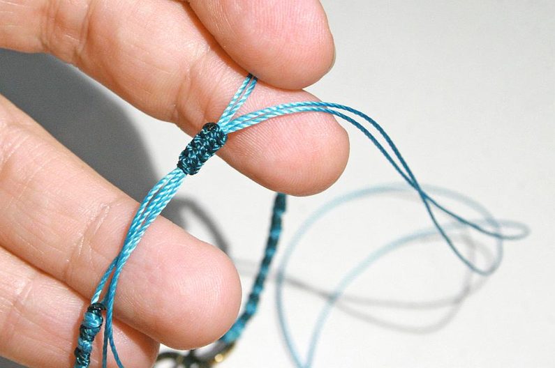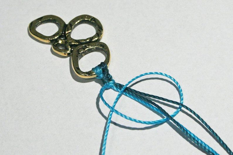 Zavážeme na každém konci šňůry uzel (Obr.16), ustřihneme a zatavíme šňůru B (Obr. 17). Šňůru A od každého konce položíme na sebe protisměrem, ustřihneme 20 cm šňůry B a zavažeme na šňůrách A (Obr.18).