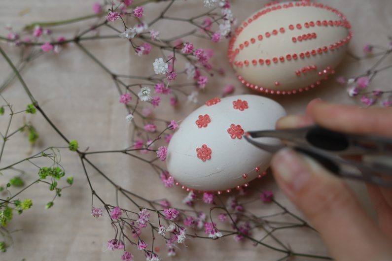 • Na vajíčko si naneste lepidlo do míst, kam chcete lepit korálky a pomocí pinzety pak nabírejte jednotlivé korálky a lepte je na vajíčko v proužcích.