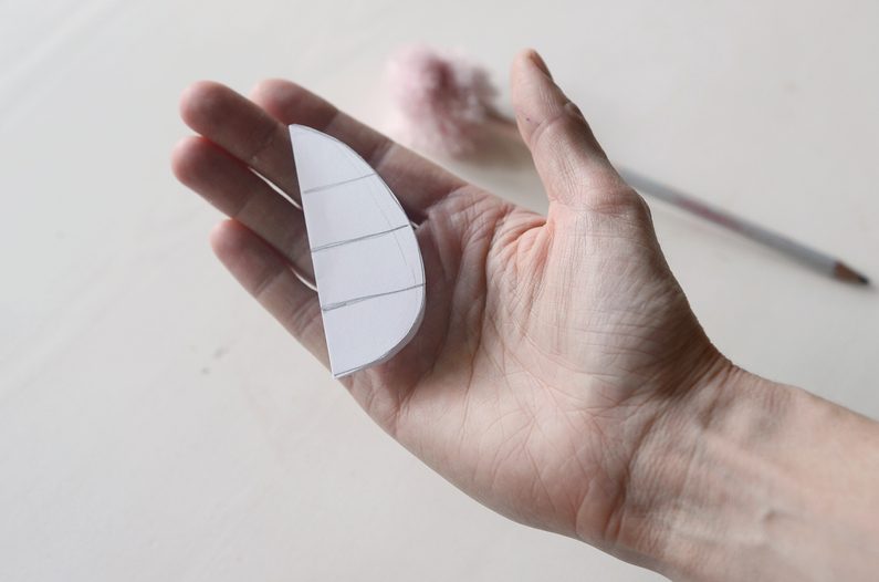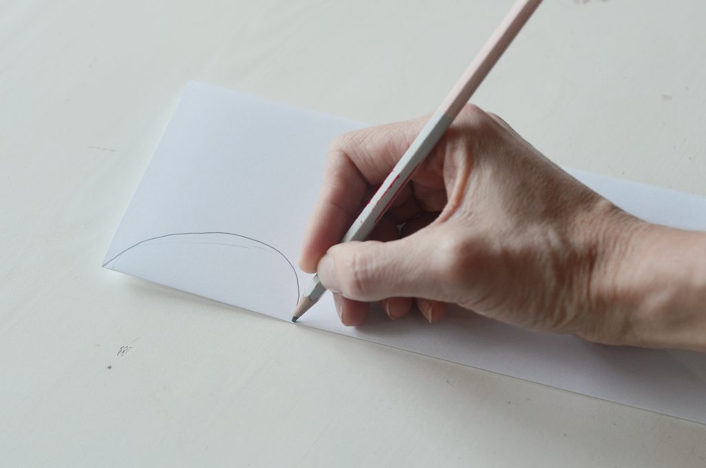 List kancelářského papíru přeložte a přes přeloženou hranu nakreslete obrys poloviny vajíčka. Díky tomuto triku získáte rovnoměrný tvar vznikající dekorace. Obrys vajíčka si vystřihněte a tužkou jej horizontálně rozdělte na třetiny.
