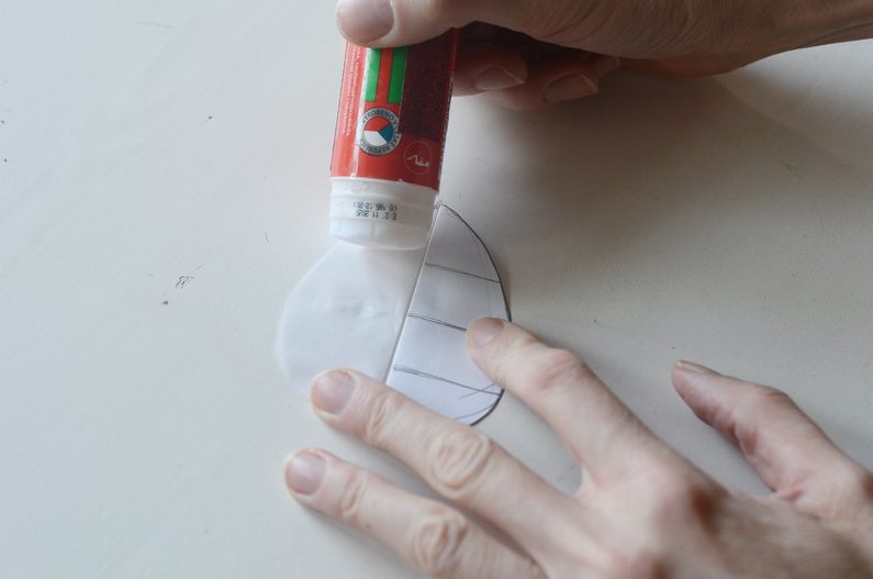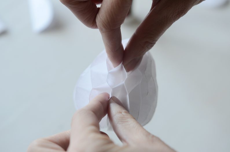 Závěrečný spoj tvoří spodní a horní vrstva, které přilepíte k sobě (dvěma spoji podle šablony). Naneste lepidlo na jednu polovinu, poté papír opatrně roztáhněte rukama a spojte i poslední dvě části k sobě. Vznikne vám tak kompaktní tvar vajíčka.