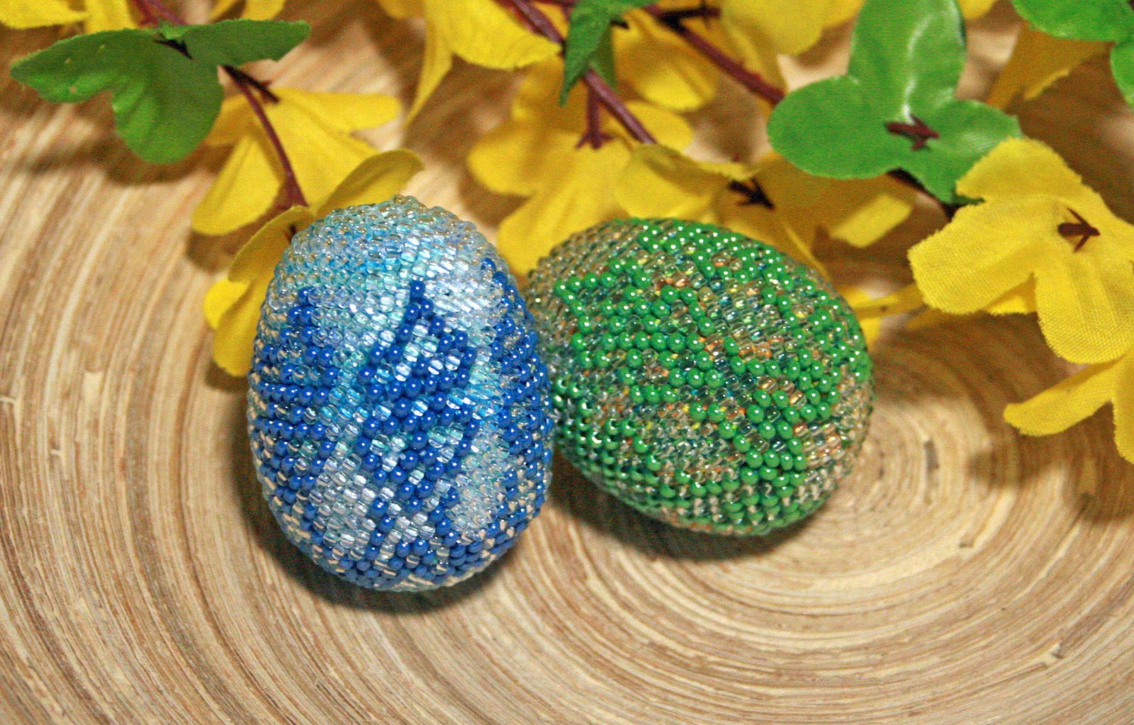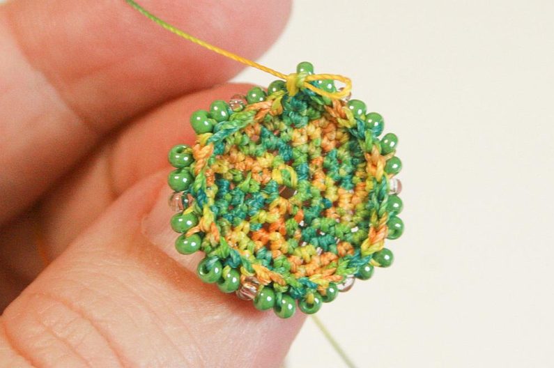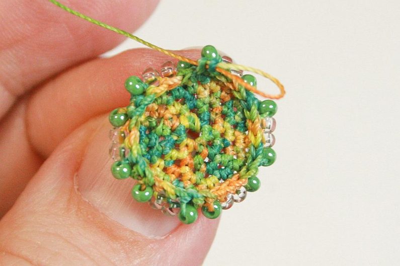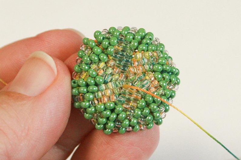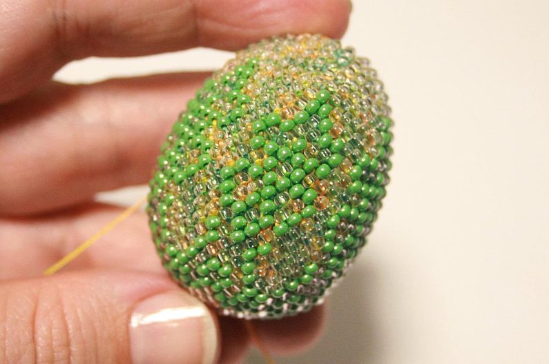 Ubíraní děláme tak, že vždy přeskočíme první korálek v každém cípu (Obr.14) – tak v každé řadě vždy ubíráme po šesti korálcích. Takto postupujeme, dokud nespotřebujeme všechny korálky. Zbytky příze schováme a odstřihneme (Obr.15). Velikonoční vajíčko máme hotovo, na zavěšení můžeme přišÍt stuhu k jednomu konci.