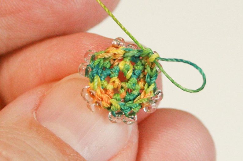 V šesté řadě háčkujte do prvního, druhého, třetího a čtvrtého oka v každém cípu (oka s korálky). Sloupek s korálkem, pak do pátého oka (bez korálku), jeden sloupek s korálkem a do stejného místa jeden prázdný sloupek (Obr. 9- 10).