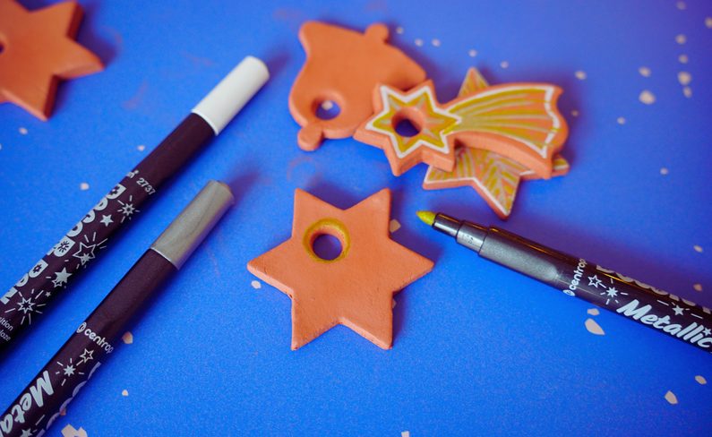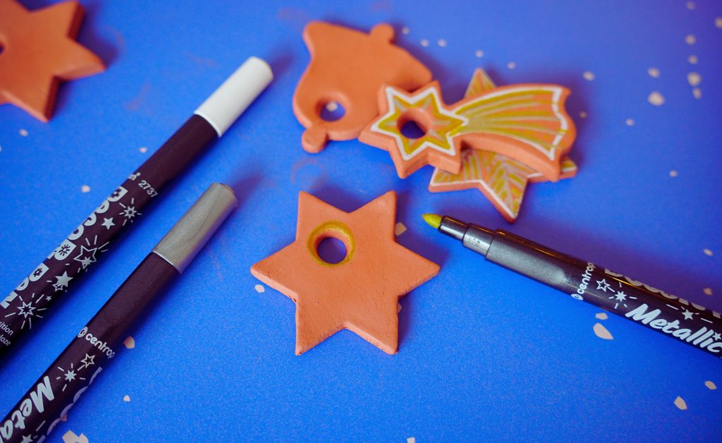 Vykrojené ozdoby necháme pár hodin uschnout. Dokonale vysušené ozdoby můžeme dekorovat podle libosti. Kreativitě se meze nekladou. :-) My jsme použili metalické fixy pro zářivější efekt.