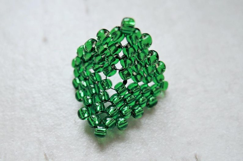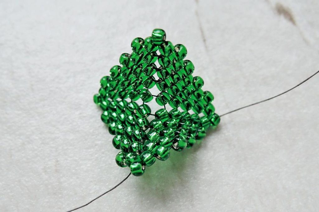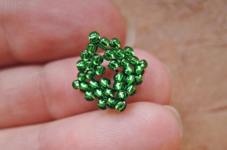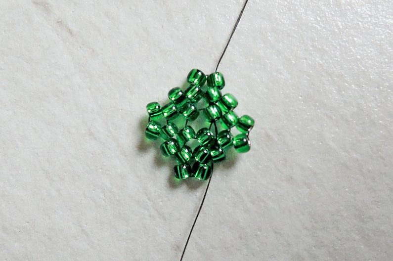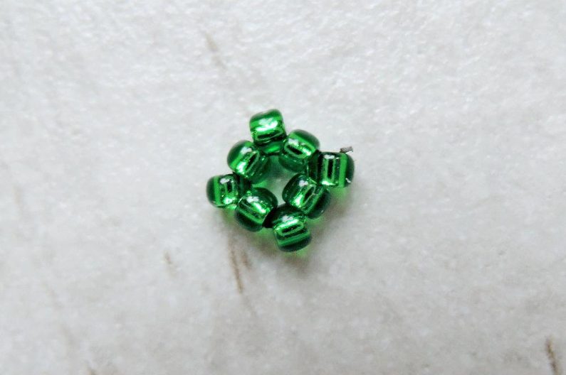 Obecné: šijte proti směru hodinových ručiček; na konci každé řady nezapomínejte na přechod do další, to znamená, že po přidání posledního TR v řadě prošijte zároveň i prvním rokajlem právě dokončené řady (obrázek 1); čísla v závorce značí počet přidaných TR v řadě. Ustřihněte si cca metr Fireline, se kterou budete pracovat, dokud vám vystačí. Poté si ustřihněte další kus a pokračujte.