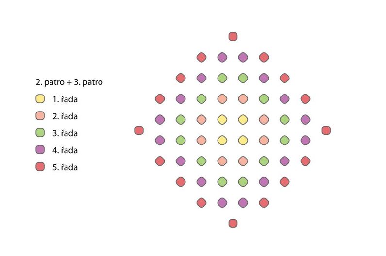 2. a 3. PATRO (jsou totožné, pro každou náušnici ušijeme 2×) 1.–4. řada jsou totožné jako v 1. PATŘE, u páté (poslední) řady přidáváme mezi dvojice ve špičce pouze po jednom TR (obrázek 7).