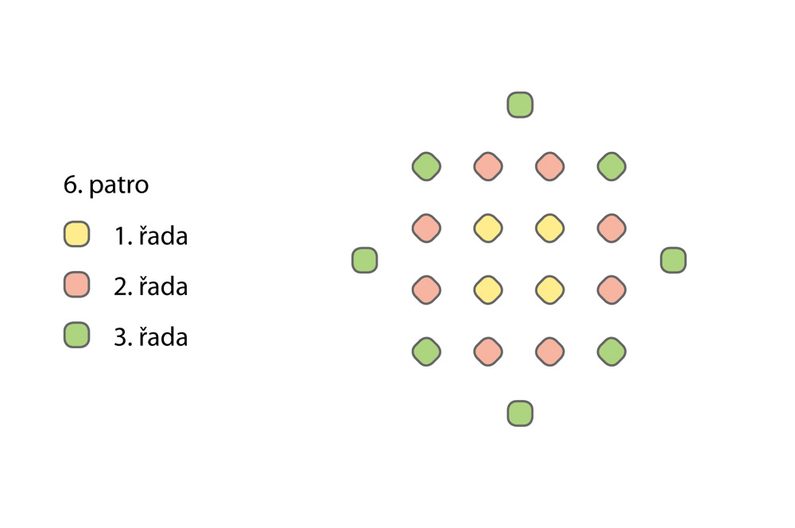 4. a 5. PATRO (jsou totožné, pro každou náušnici ušijeme 2×) 1.–3. řada jsou totožné jako v 1. patře, u čtvrté (poslední) řady přidáváme mezi dvojice ve špičce pouze po jednom TR (obrázek 9).