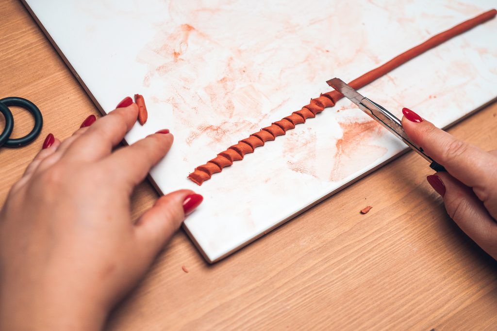• Ze samotvrdnoucí hmoty si vyválíme plát silný cca 3 mm. Položíme na něj sklenici a uřízneme hmotu, která odpovídá jejímu obvodu. Hmotu uzpůsobíme pomocí ulamovacího nože a seřízneme nadbytečné okraje.