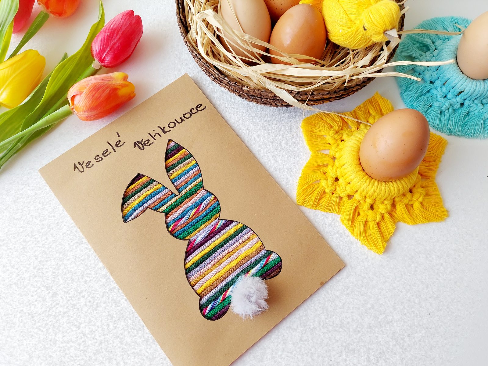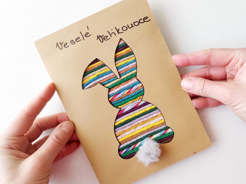 • Po zaschnutí můžeme přilepit ocásek z chlupaté příze a nadepsat. Přání máme hotové.