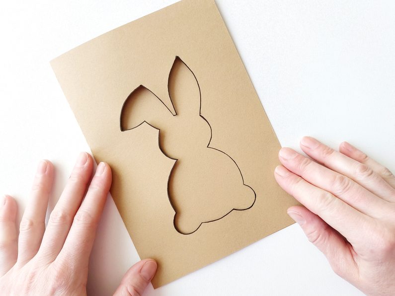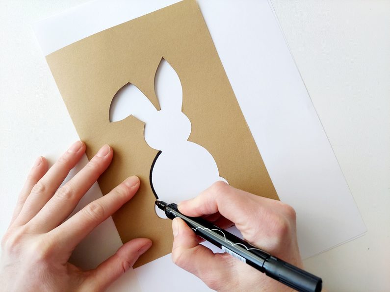 • Zajíčka si vystřihneme a popisovačem zvýrazníme jeho obrys. Abychom si přání neumazali, vložíme do něj papír jako podložku.