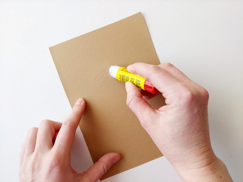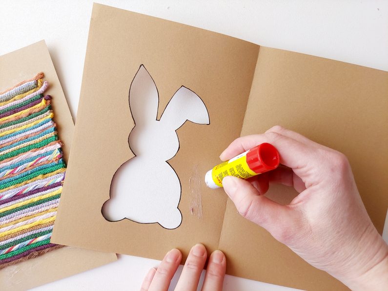 • Na papír, který odpovídá velikosti přání (v našem případě A5), začneme postupně lepit jednotlivé kousky přízí. Lepíme minimálně 2 cm od kraje.