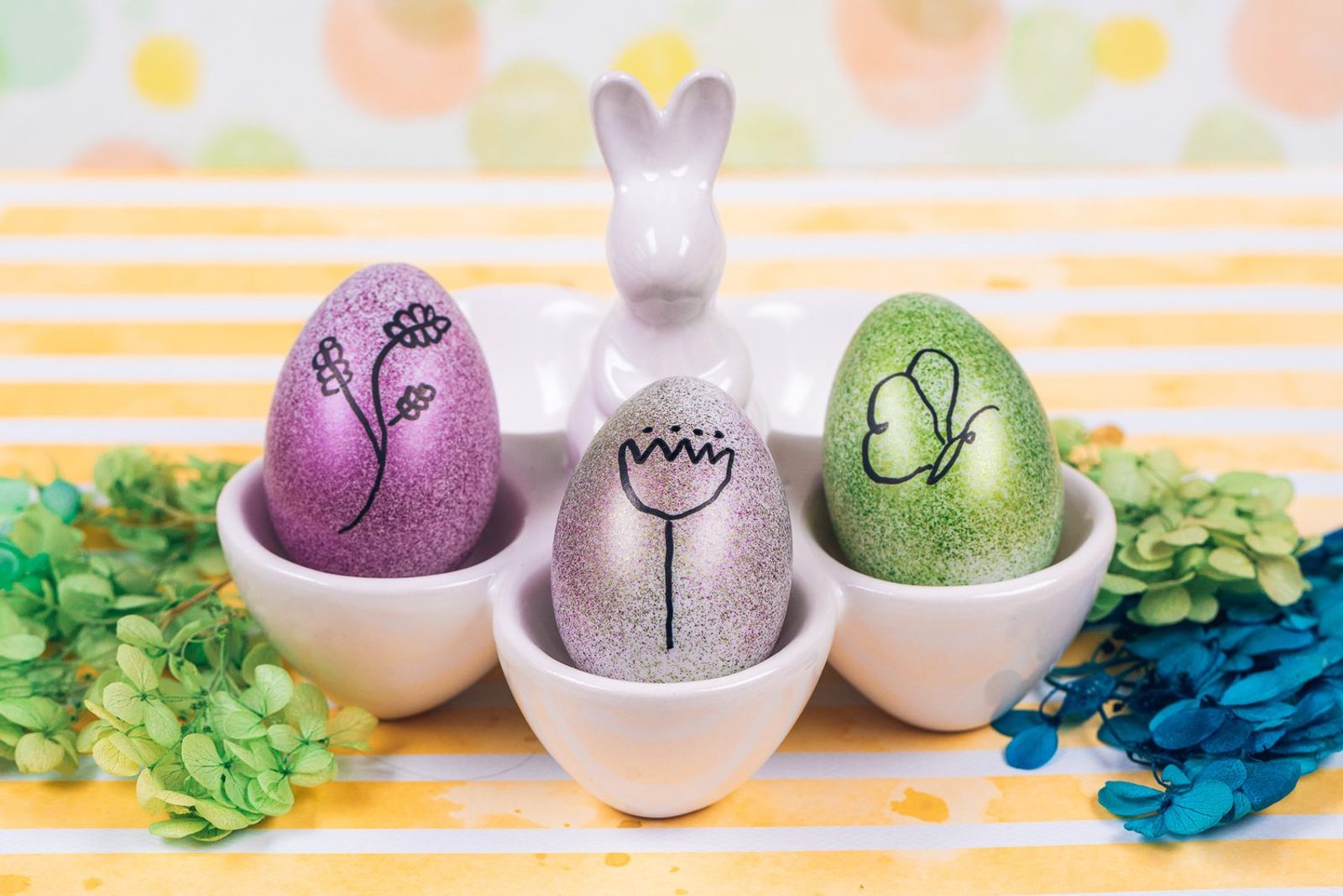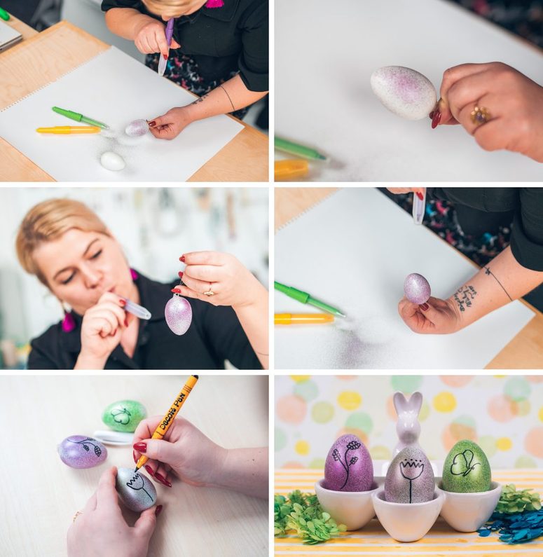 Připravíme si zakrytou pracovní plochu. Pomocí foukacích fix naneseme na vajíčka barvu v požadovaném množství. Počkáme, až barva úplně zaschne a poté pomocí černého decorpenu nakreslíme jednoduchými liniemi květiny, zvířátka nebo cokoliv, co se nám líbí.