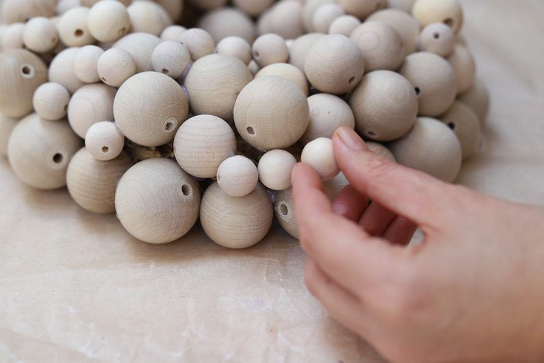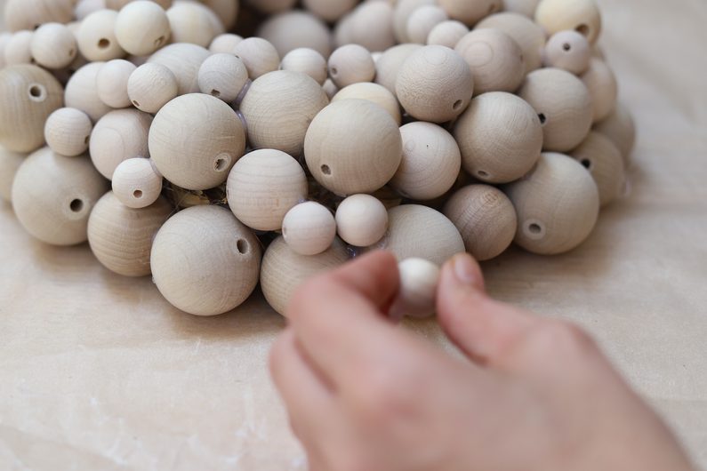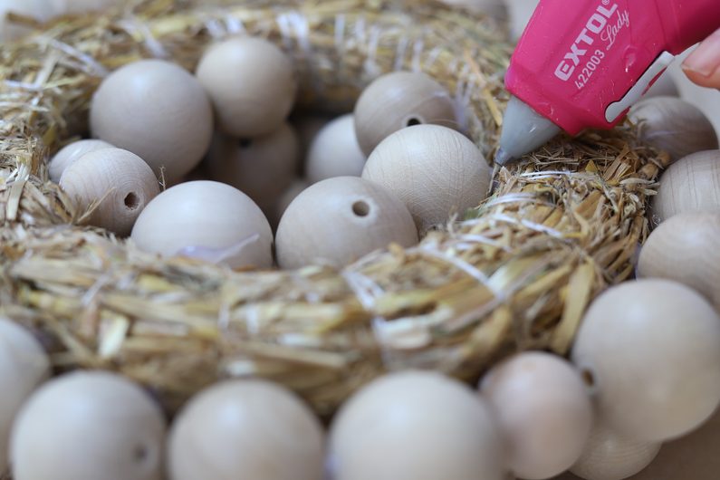 • Na slaměný základ postupně přichytíme tavnou pistolí všechny korálky. Postupujte spíš od větších a menšími pak zakryjte poslední dírky.