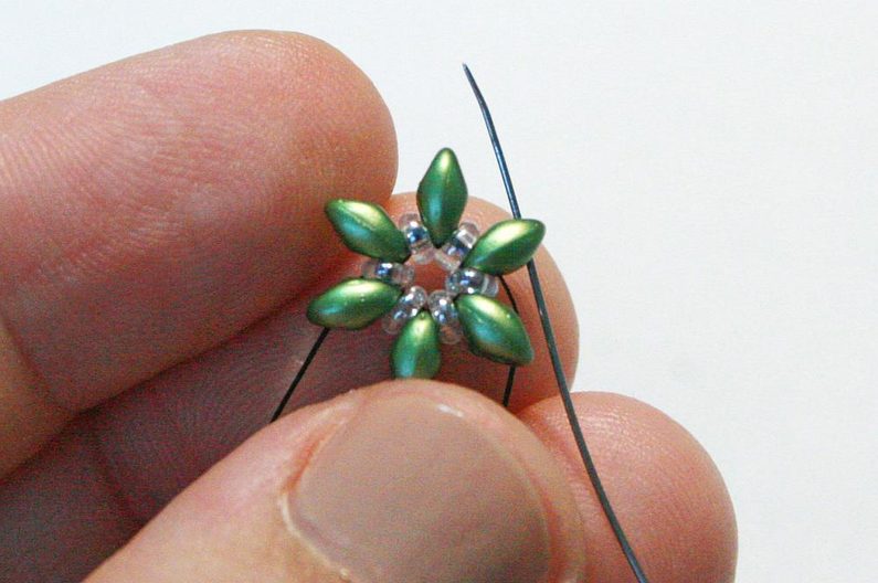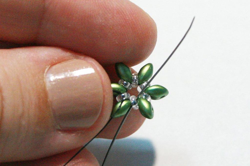 Ustřihněte si kolem 1 m niti One-G. Navlékněte střídavě 6 Superduo a 6 TOHO Demi round, posuňte na konec niti a zauzlíkujte (Obr. 1). Obejděte dvakrát dokola jenom korálky TOHO Demi round – tím zformujete hezký střed kytičky (Obr. 2). Dále projdeme skrz horní dírku Superdua (Obr. 3).