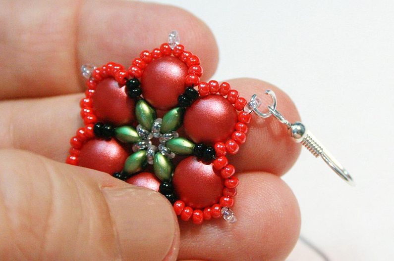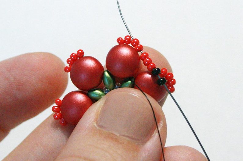 Navlékněte jeden korálek TOHO Demi round a projděte skrz druhý pár červeného rokajlu (tím zformujete špičku lístečku; Obr. 7). Navlékáme tři červené korálky a dva černé, projdeme skrz horní dírku Super dua (Obr. 8). Teď projdeme skrz černé korálky (ty budou společné pro dva sousední lístečky; Obr. 9).