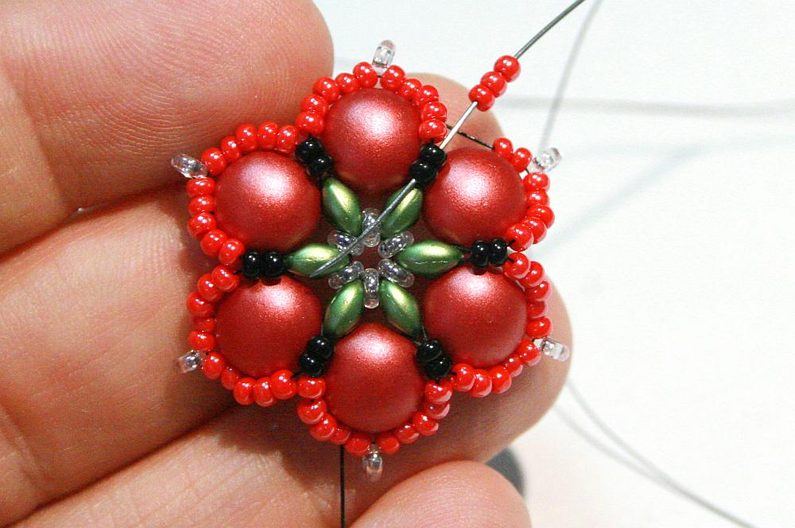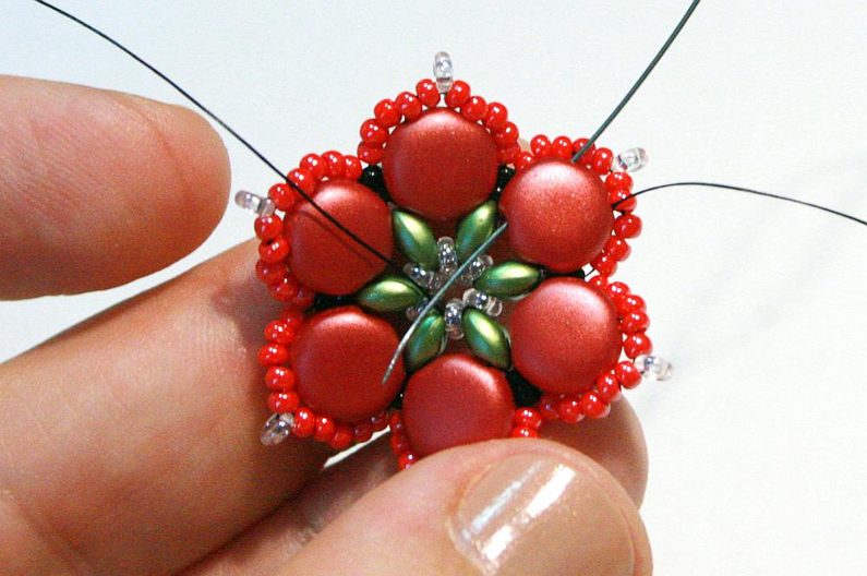 Navlékněte tři červené korálky a projděte skrz dva černé a dále do horní dírky Superdua (Obr. 13). Dále, abychom zpevnili tvar kytičky, musíme mezi každými dvěma Candy všít po dvou korálcích (Obr. 14–17).