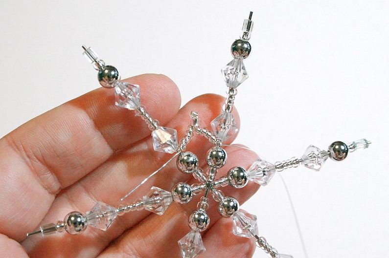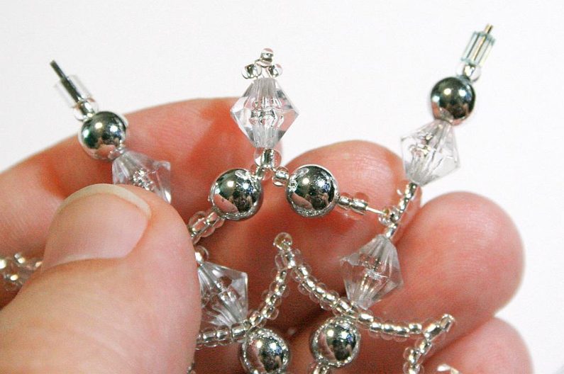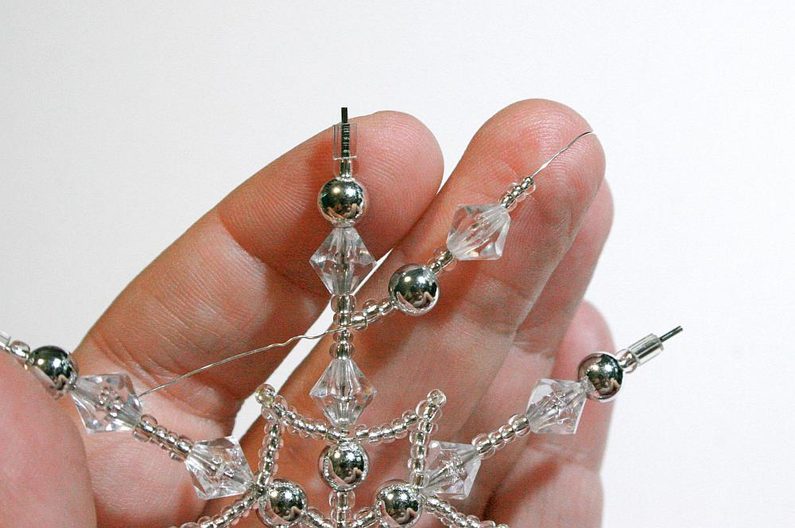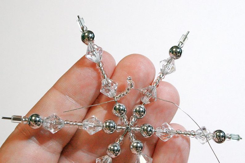 Ustřihneme si 1m drátku. Uděláme pár otoček na jednom z ramen hvězdy mezi korálky PR10 v centrální části ramena. Dále navlékneme na drát korálky v takovémto pořadí: PR10 – PR8 – PR10 – AP6 – PR10 – PR8 – AB8 – 3x PR10 (Obr.7). Vynecháme poslední 3 korálky a projdeme přes korálky AB8 – PR8 (Obr.8) Navlékneme korálky PR10 – PR8 – PR10 a uděláme dvě otočky kolem dalšího ramene hvězdy (Obr.9)