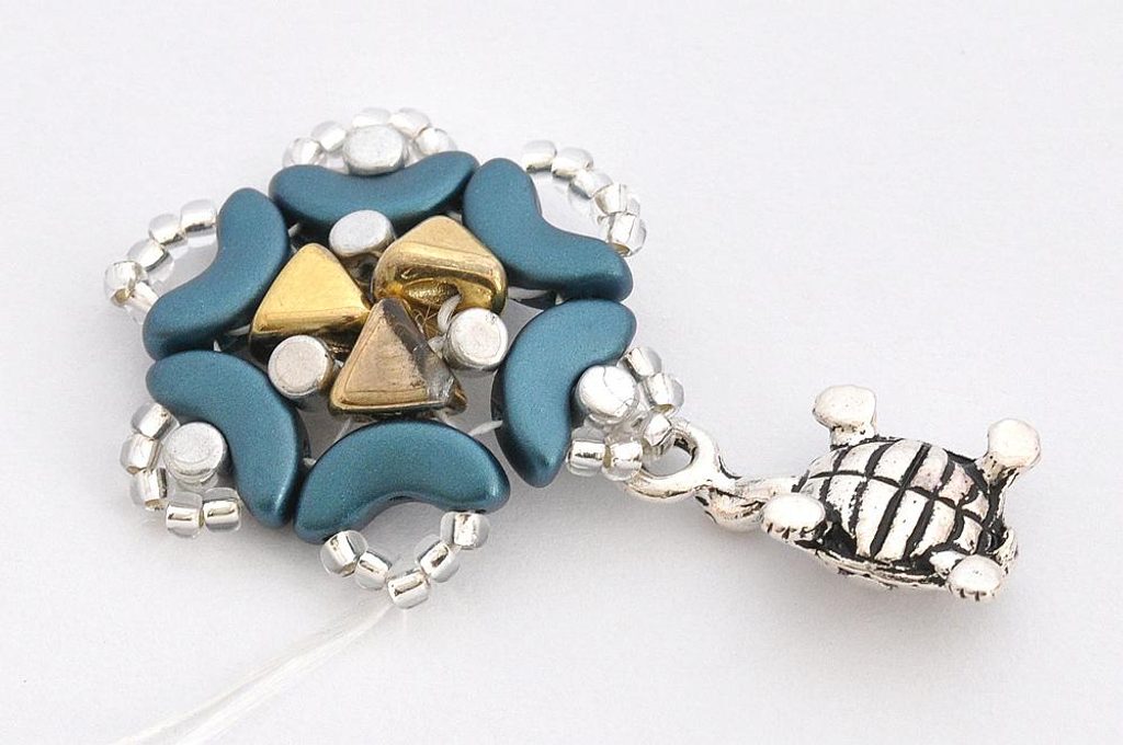 Nit nyní vychází z jednoho rokajlu uprostřed „okvětního plátku“. K němu přišijeme kovový přívěsek.