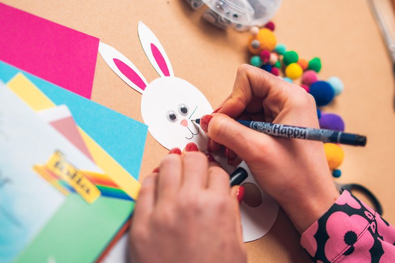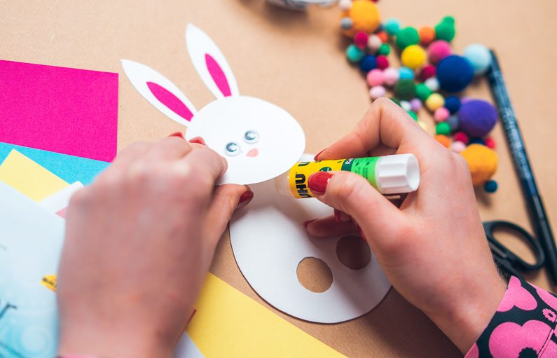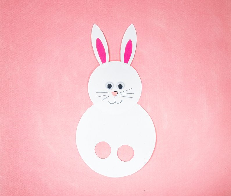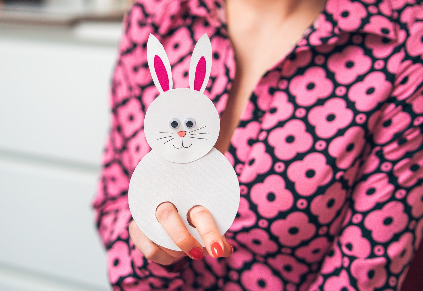 Podle šablony (ke stažení výše ("Stáhnout návod") jako .pdf) si vystřihneme tělo, hlavičku a uši zajíčka z bílého papíru. Všechny části slepíme dohromady lepidlem. Ouška i tělíčko lepíme za hlavičku. Pomocí špičatých nůžek vystřihneme v tělíčku dva otvory na prsty v místech kde je v šabloně šrafovaná čára. Do oušek vlepíme růžové vnitřky ouška, na hlavičku přilepíme nalepovací očíčka a pomocí fixky a popisovače dokreslíme čumáček, pusinku a fousky.
