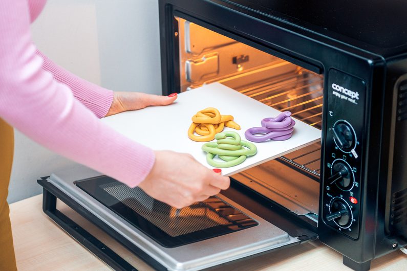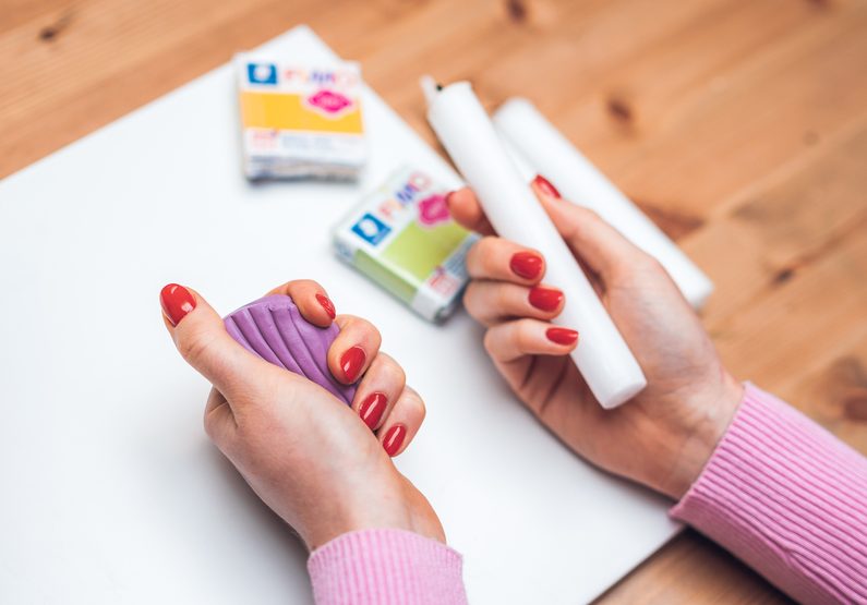 • Celou jednu kostičku hmoty FIMO si rozbalíme a zpracujeme rukama.