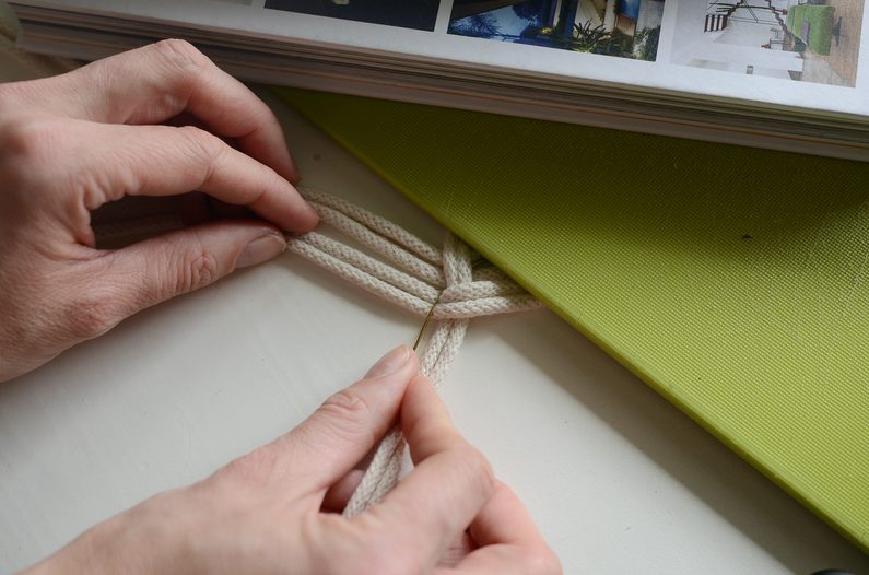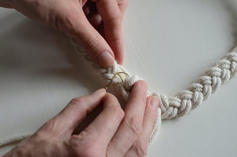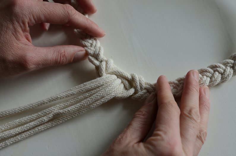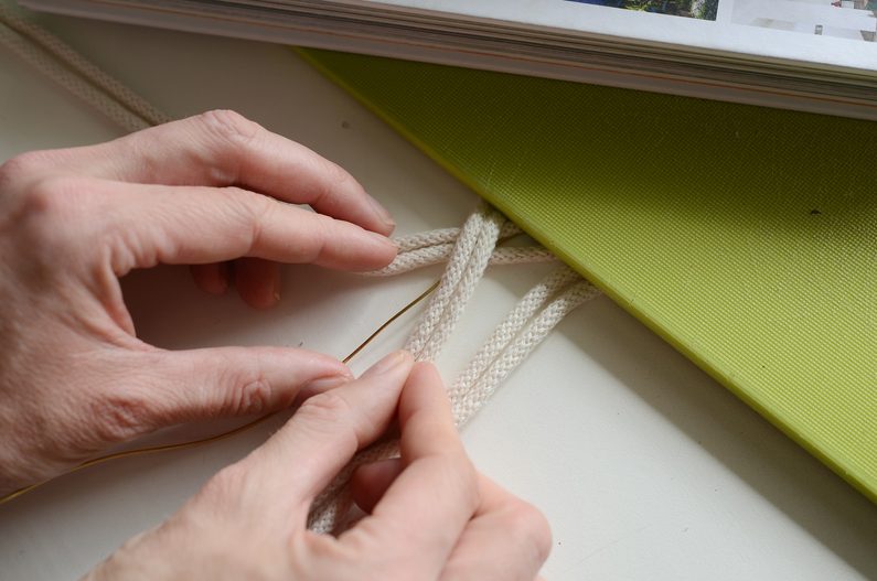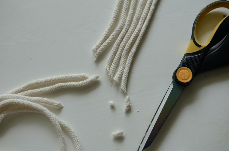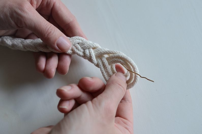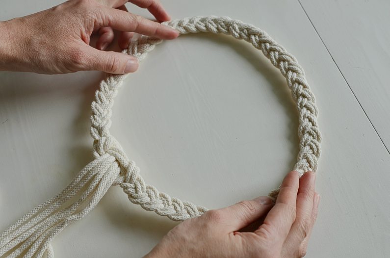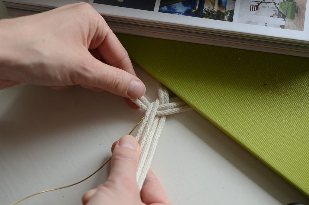 Nastříhejte si tři kusy macramé šňůry v délce zhruba 2 metrů a drátek v délce zhruba 1 metr (pro věnec o průměru 22 centimetrů). Přeložte šňůry v polovině, vložte do středu drátek a zatižte konce, aby se vám věnec snáze motal. Rozdělte konce šňůr po dvou a veďte levou část přes středové dva konce.